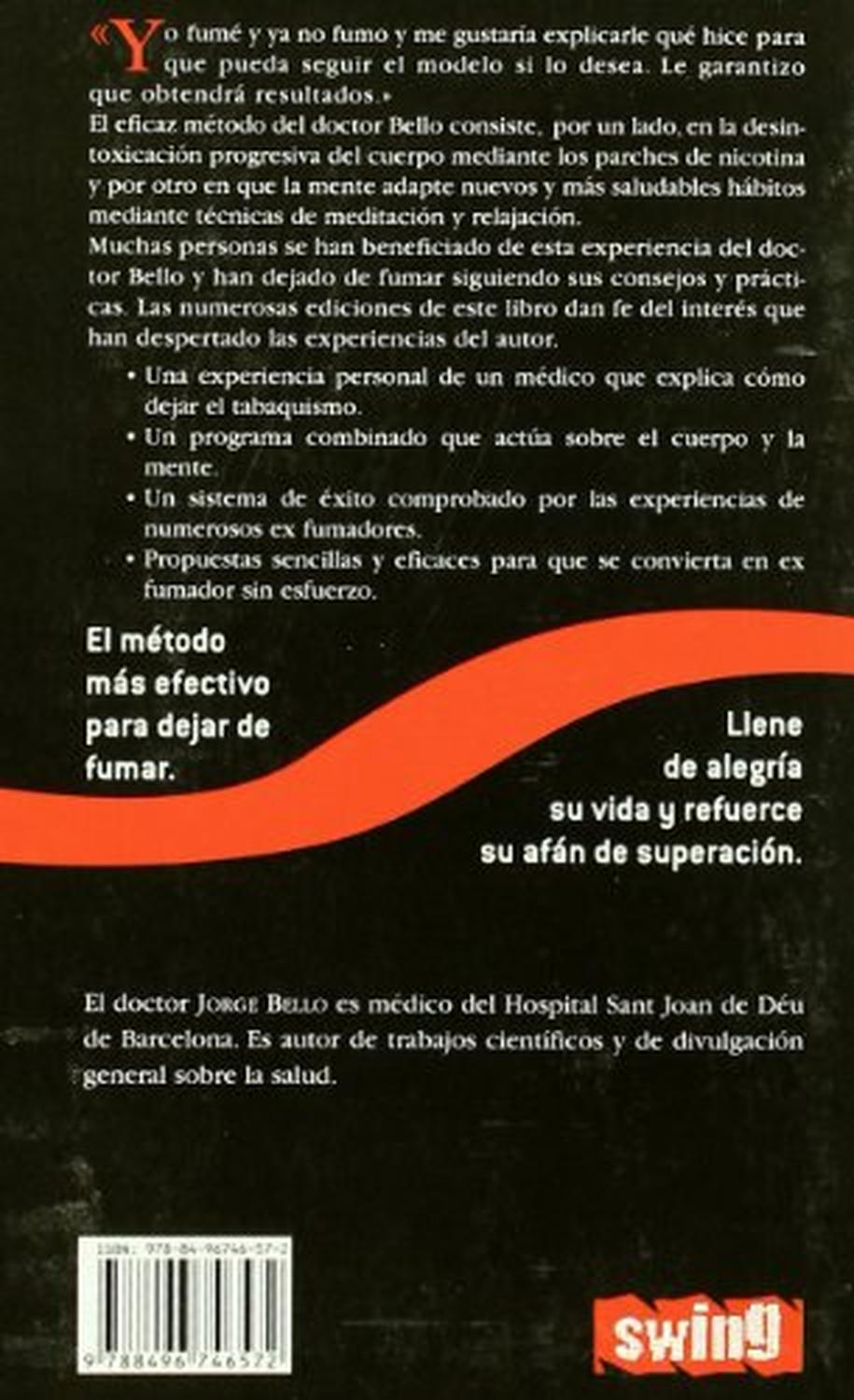 Biografía del autor Dr. Jorge Bello is a physician specializing in pediatrics at the Institut Català de la Salut in Barcelona, as well as an author and an editor of professional texts. Reseña del editor Una sabia combinación de terapias y técnicas médicas y psicológicas para solucionar definitivamente y sin esfuerzo el problema del tabaco. Un libro necesario. Necesario porque representa la solución a un problema cada vez más generalizado y cada vez más urgente. Se trata de un trastorno de salud que afecta a muchas personas, la mayoría con ganas de curarse, todas con la urgente necesidad de hacerlo...