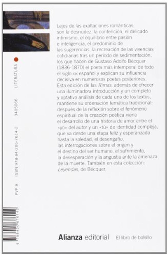 Lejos de las exaltaciones románticas, son la desnudez, la contención, el delicado intimismo, el equilibrio entre pasión e inteligencia, el predominio de las sugerencias, la recreación de las vivencias cotidianas tras un periodo de sedimentación, los que hacen de Gustavo Adolfo Bécquer (1836-1870) el poeta más intemporal de todo el siglo XIX español y explican su influencia decisiva en numerosos poetas posteriores. Esta edición de las "Rimas", además de ofrecer una iluminadora introducción y un completo y optativo análisis de cada uno de los textos, mantiene su ordenación temática tradicional: después de la reflexión sobre el fenómeno espiritual de la creación poética viene el desarrollo de una historia de amor entre el "yo" del autor y un "tú" de identidad compleja, que va desde una etapa feliz y esperanzada hasta la soledad, el desengaño, las interrogaciones sobre el origen y el destino del ser humano, el sufrimiento, la desesperación y la angustia ante la amenaza de la muerte. También en esta colección: "Leyenda"s, de Bécquer.