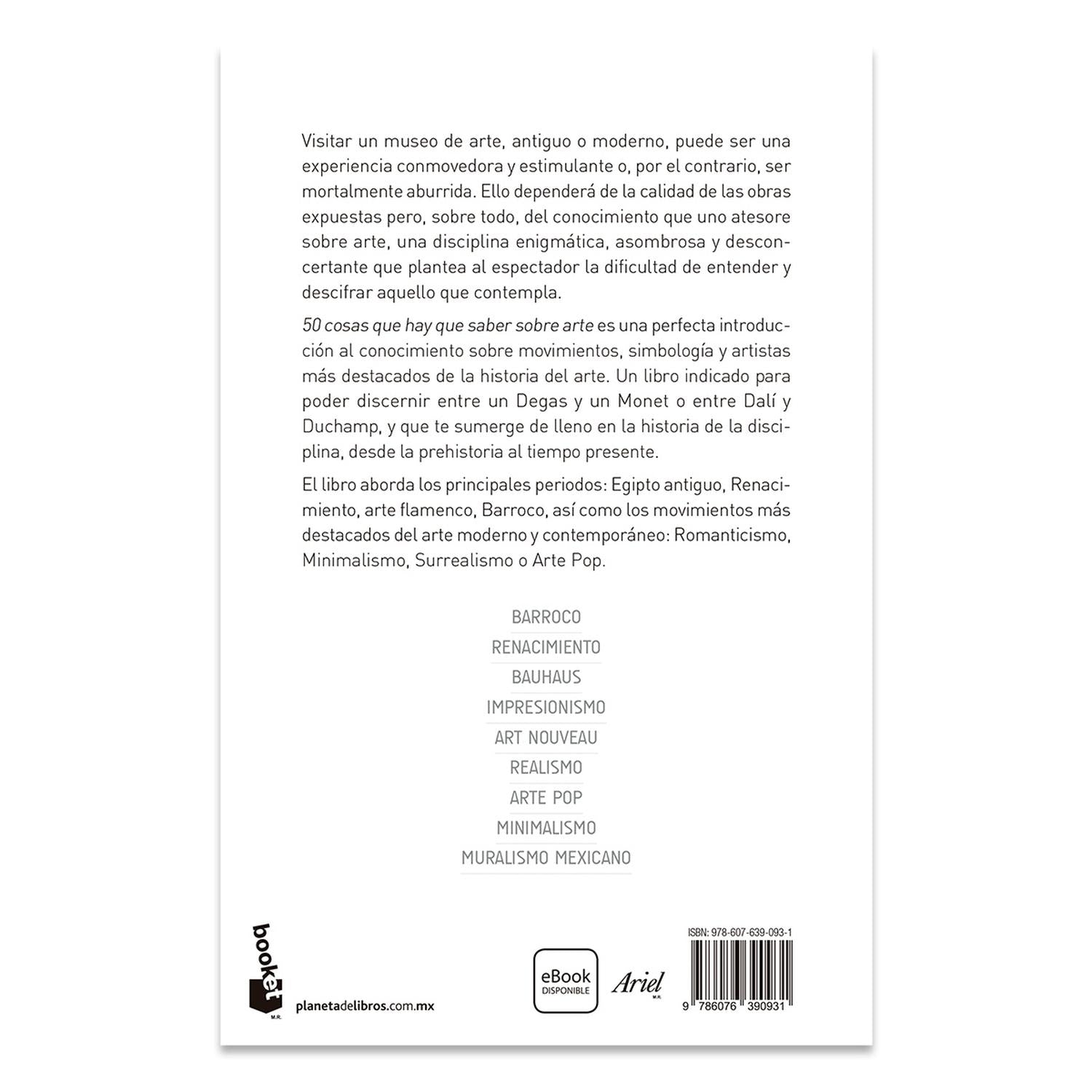 Descripción: Una exploración de las ideas, las técnicas y las creaciones que han marcado el devenir del arte desde la prehistoria hasta nuestros días. ¿Cuál es la diferencia entre una pintura del barroco y una del rococó? ¿A qué movimiento pertenecen Los Nenúfares de Monet y Los Girasoles de Van Gogh? 50 cosas que hay que saber sobre arte es una perfecta introducción al conocimiento sobre movimientos, simbología y artistas más destacados de la historia del arte. Un libro indicado para aquellos incapaces de discernir entre un Degas o un Monet o entre Dalí y Duchamp, y que te sumerge de lleno en la historia de la disciplina, desde la prehistoria al tiempo presente.