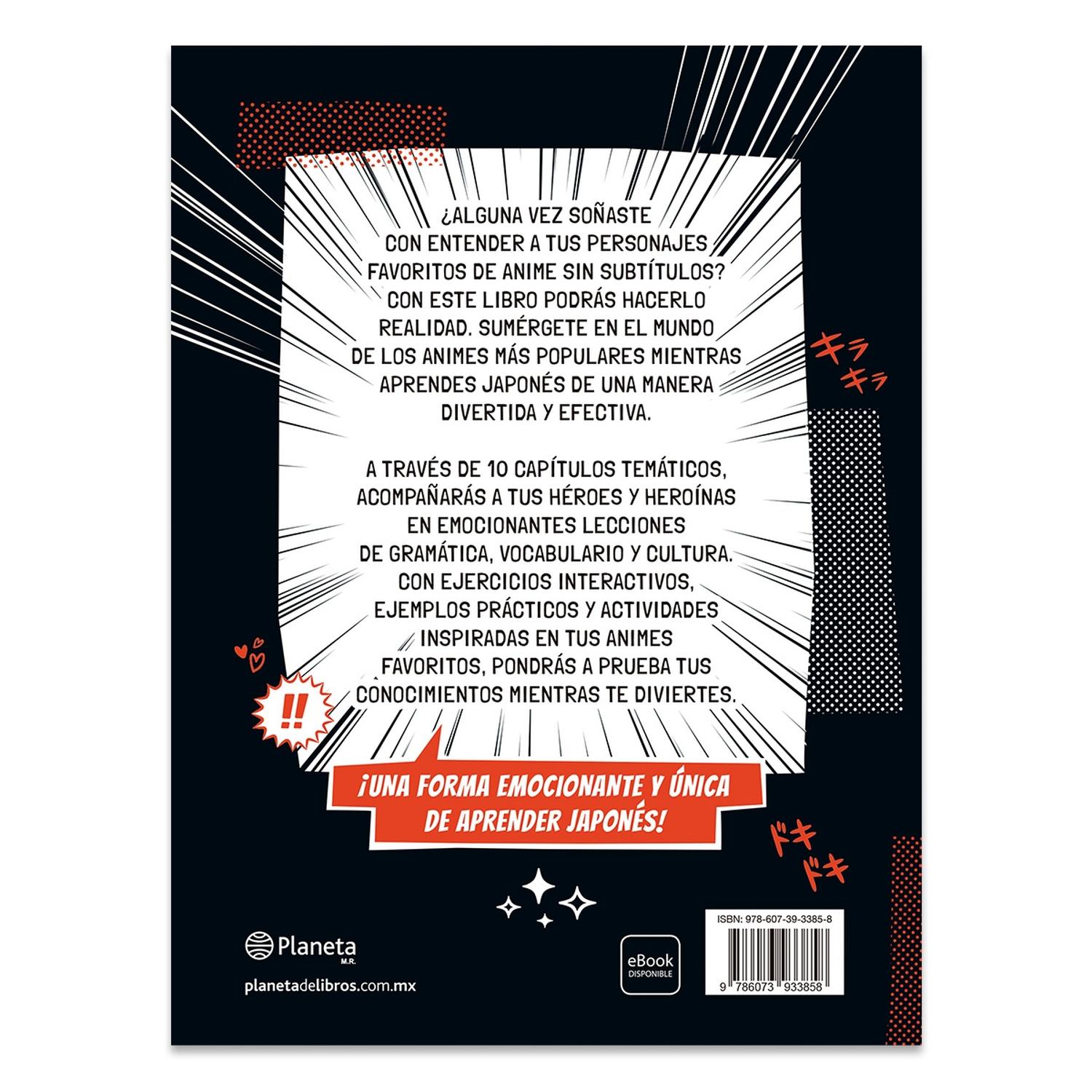 Descripción: El método perfecto para fans del anime que quieren dominar el japonés.¿ Alguna vez has soñado con entender sin subtítulos a tus personajes favoritos de anime? Con este libro, podrás hacerlo realidad. Sumérgete en el mundo de los animes más populares mientras aprendes japonés de manera divertida y efectiva. A través de 10 capítulos temáticos, acompañarás a tus héroes y heroínas en emocionantes lecciones de gramática, vocabulario y cultura.Con ejercicios interactivos, ejemplos prácticos y actividades inspiradas en tus animes favoritos, pondrás a prueba tus conocimientos mientras te diviertes. ¡Una forma emocionante y única de aprender japonés!