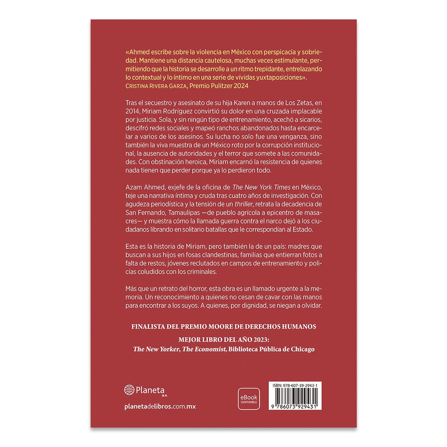 Descripción: FINALISTA DEL PREMIO MOORE DE DERECHOS HUMANOS MEJOR LIBRO DEL AÑO 2023: The New Yorker, The Economist, Biblioteca Pública de Chicago Ahmed escribe sobre la violencia en México con perspicacia y sobriedad. Mantiene una distancia cautelosa, muchas veces estimulante, permitiendo que la historia se desarrolle a un ritmo trepidante, entrelazando lo contextual y lo íntimo en una serie de vívidas yuxtaposiciones. Cristina Rivera Garza, Premio Pulitzer 2024 FINALISTA DEL PREMIO MOORE DE DERECHOS HUMANOS MEJOR LIBRO DEL AÑO 2023: The New Yorker,The Economist, Biblioteca Pública de Chicago Tras el secuestro y asesinato de su hija Karen a manos de Los Zetas, en 2014, Miriam Rodríguez convirtió su dolor en una cruzada implacable por justicia. Sola, y sin ningún tipo de entrenamiento, acechó a sicarios, descifró redes sociales y mapeó ranchos abandonados hasta encarcelar a varios de los asesinos. Su lucha no solo fue una venganza, sino también la viva muestra de un México roto por la corrupción institucional, la ausencia de autoridades y el terror que somete a las comunidades. Con obstinación heroica, Miriam encarnó la resistencia de quienes nada tienen que perder porque ya lo perdieron todo. Azam Ahmed, exjefe de la oficina de The New York Timesen México, teje una narrativa íntima y cruda tras cuatro años de investigación. Con agudeza periodística y la tensión de un thriller, retrata la decadencia de San Fernando, Tamaulipas —de pueblo agrícola a epicentro de masacres— y muestra cómo la llamada guerra contra el narco dejó a los ciudadanos librando en solitario batallas que le correspondían al Estado. Esta es la historia de Miriam, pero también la de un país: madres que buscan a sus hijos en fosas clandestinas, familias que entierran fotos a falta de restos, jóvenes reclutados en campos de entrenamiento y policías coludidos con los criminales. Más que un retrato del horror, esta obra es un llamado urgente a la memoria. Un reconocimiento a quienes no cesan de cavar con las manos para encontrar a los suyos. A quienes, por dignidad, se niegan a olvidar.