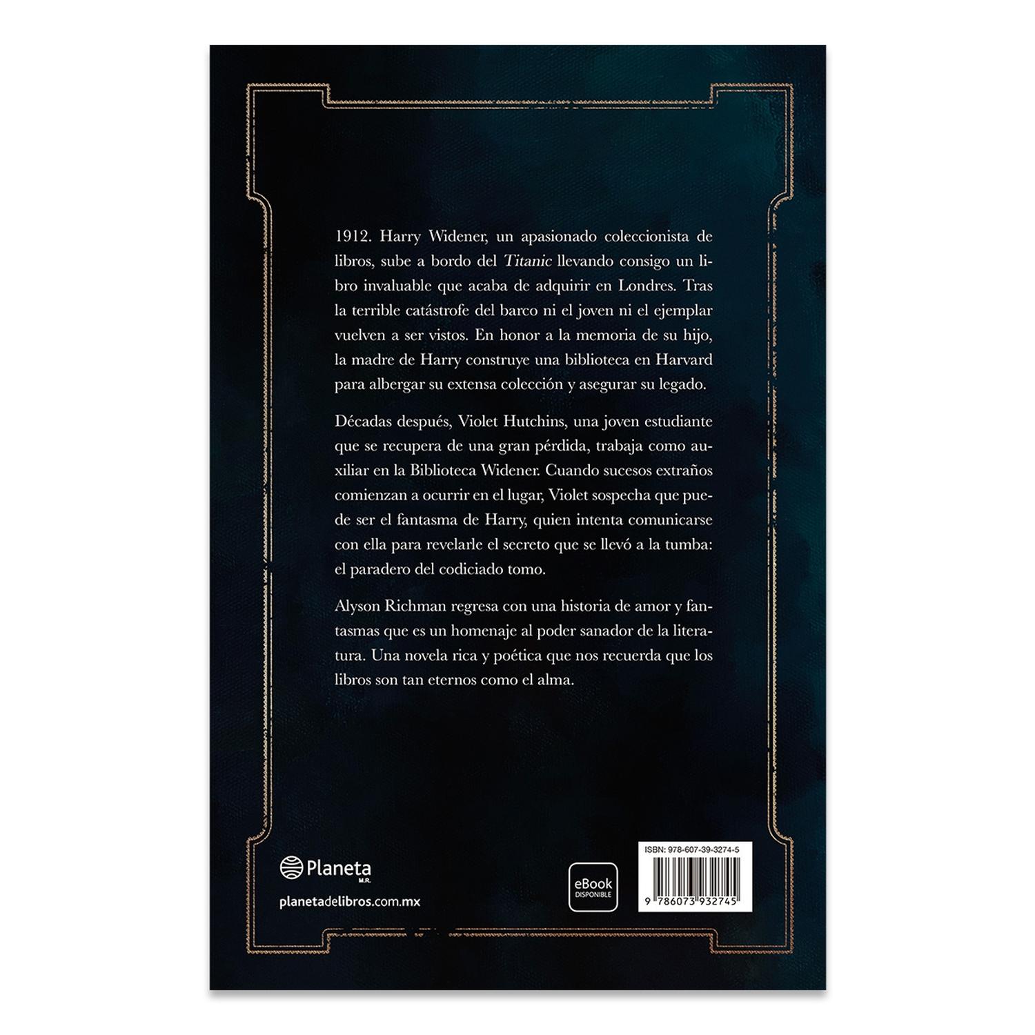 Descripción: Una travesía de amor y libros que desafía el tiempo 1912. Harry Widener, un apasionado coleccionista de libros sube a bordo del Titanic llevando consigo un libro invaluable que acaba de adquirir en Londres. Tras la terrible catástrofe del barco ni el joven ni el ejemplar vuelven a ser vistos. En honor a la memoria de su hijo, la madre de Harry construye una biblioteca en Harvard para albergar su extensa colección y asegurar su legado. Décadas después, Violet Hutchins, una joven estudiante que se recupera de una gran pérdida, trabaja como auxiliar en la Biblioteca Widener. Cuando sucesos extraños comienzan a ocurrir en el lugar, poco a poco Violet sospecha que puede ser el fantasma de Harry, quien intenta comunicarse con ella para revelarle el secreto que se llevó a la tumba: el paradero del codiciado tomo. Regresa Alyson Richman con una historia de amor y fantasmas que es un homenaje al poder sanador de la literatura. Una novela rica y poética que nos recuerda que los libros son tan eternos