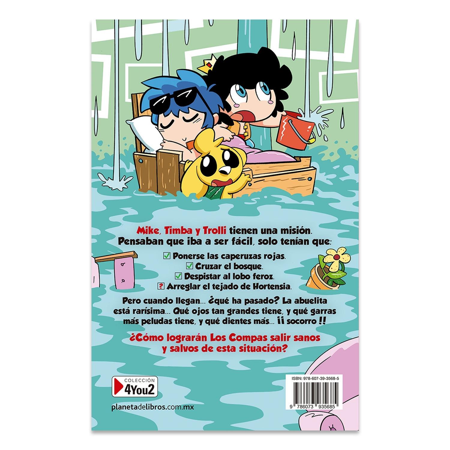 Descripción: ¡Los cuentos clásicos como nunca te los han contado! Ahora Caperucita Roja y Los tres cerditos al más puro estilo de Los Compas. Mike, Timba y Trolli tienen una misión. Pensaban que iba a ser fácil, solo tenían que: ☑ Ponerse las caperuzas rojas. ☑ Cruzar el bosque. ☑ Despistar al lobo feroz. ☐ Arreglar el tejado de Hortensia. Pero al llegar… algo no cuadra. La abuelita está rarísima… ¡Qué ojos tan grandes tiene! ¡Y qué garras tan peludas! ¡Y qué dientes tan... AAAAAH! ¿Cómo lograrán Los Compas salir sanos y salvos de este cuento tan loco?