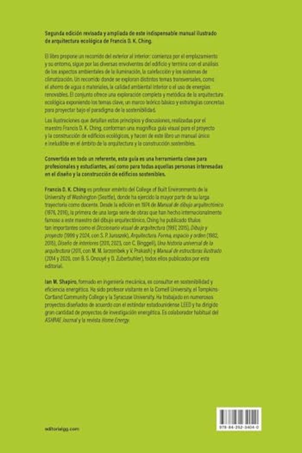 Descripción: El libro propone un recorrido del exterior al interior: comienza por el emplazamiento y su entorno, sigue por las diversas envolventes del edificio y termina con el análisis de los aspectos ambientales de la iluminación, la calefacción y los sistemas de climatización. Un recorrido donde se exploran distintos temas transversales, como el ahorro de agua o materiales, la calidad ambiental interior o el uso de energías renovables. El conjunto ofrece una exploración completa y metódica de la arquitectura ecológica exponiendo los temas clave, un marco teórico básico y estrategias concretas para proyectar bajo el paradigma de la sostenibilidad. Las ilustraciones que detallan estos principios y discusiones, realizadas por el maestro Francis D. K. Ching, conforman una magnífica guía visual para el proyecto y la construcción de edificios ecológicos, y hacen de este libro un manual único e ineludible en el ámbito de la arquitectura y la construcción sostenibles.