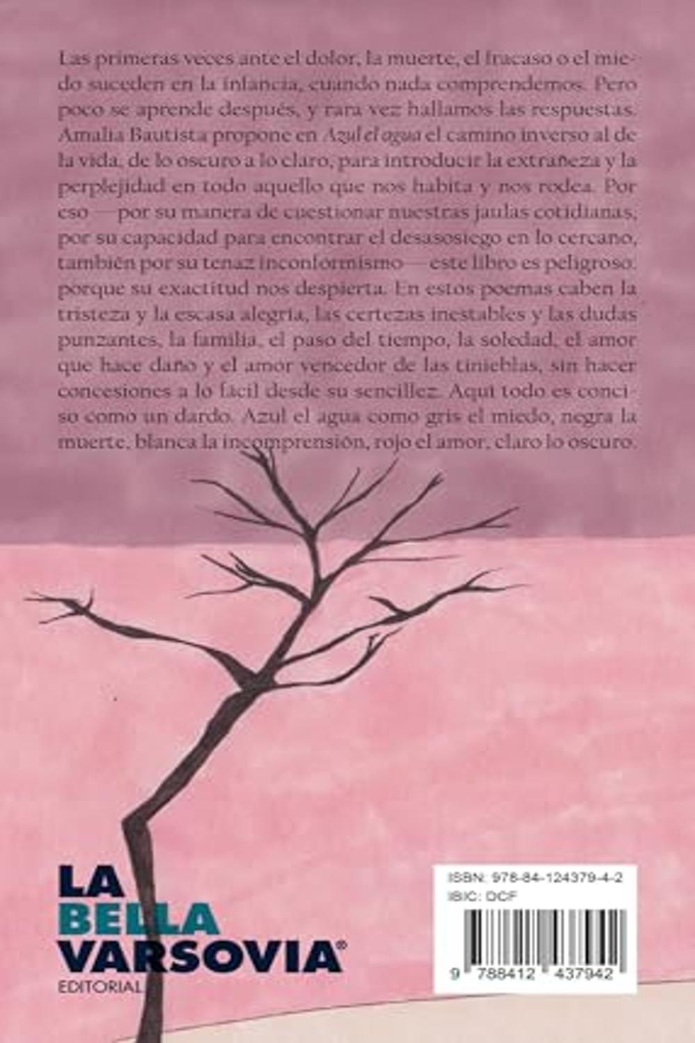 Las primeras veces ante el dolor, la muerte, el fracaso o el miedo suceden en la infancia, cuando nada comprendemos. Pero poco se aprende después, y rara vez hallamos las respuestas. Amalia Bautista propone en Azul el agua el camino inverso al de la vida, de lo oscuro a lo claro, para introducir la extrañeza y la perplejidad en todo aquello que nos habita y nos rodea. Por eso —por su manera de cuestionar nuestras jaulas cotidianas, por su capacidad para encontrar el desasosiego en lo cercano, también por su tenaz inconformismo— este libro es peligroso: porque su exactitud nos despierta.