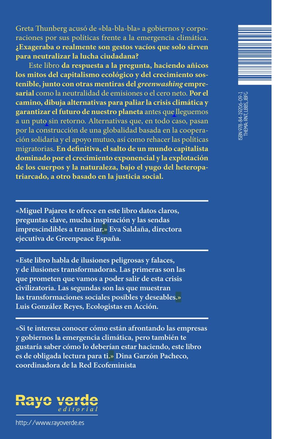 Descripción: Greta Thunberg acusó de "bla-bla-bla" a gobiernos y corporaciones por sus políticas frente a la emergencia climática. ¿Exageraba o realmente son gestos vacíos que solo sirven para neutralizar la lucha ciudadana? Este libro "ganador del Premio Llibreter 2024 en la categoría de ensayo" da respuesta a la pregunta, haciendo añicos los mitos del capitalismo ecológico y del crecimiento sostenible, junto con otras mentiras del greenwashing empresarial como la neutralidad de emisiones o el cero neto. Por el camino, dibuja alternativas para paliar la crisis climática y garantizar el futuro de nuestro planeta antes que lleguemos a un punto sin retorno. Alternativas que, en todo caso, pasan por la construcción de una globalidad basada en la cooperación solidaria y el apoyo mutuo, así como rehacer las políticas migratorias.