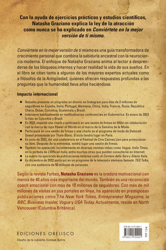 Descripción: Con la ayuda de ejercicios prácticos y estudios científicos, Natasha Graziano explica la ley de la atracción como nunca se ha explicado en Conviértete en la mejor versión de ti mismo. Conviértete en la mejor versión de ti mismo es una guía transformadora de crecimiento personal que combina la sabiduría ancestral con la neurociencia moderna. El enfoque de Natasha Graziano anima al lector a desprenderse de los bloqueos internos y hacer realidad la vida de sus sueños. En el libro se citan tanto a algunos de los mayores expertos actuales como a filósofos de la Antigüedad, quienes ofrecen respuestas profundas a las preguntas que la humanidad lleva años haciéndose.