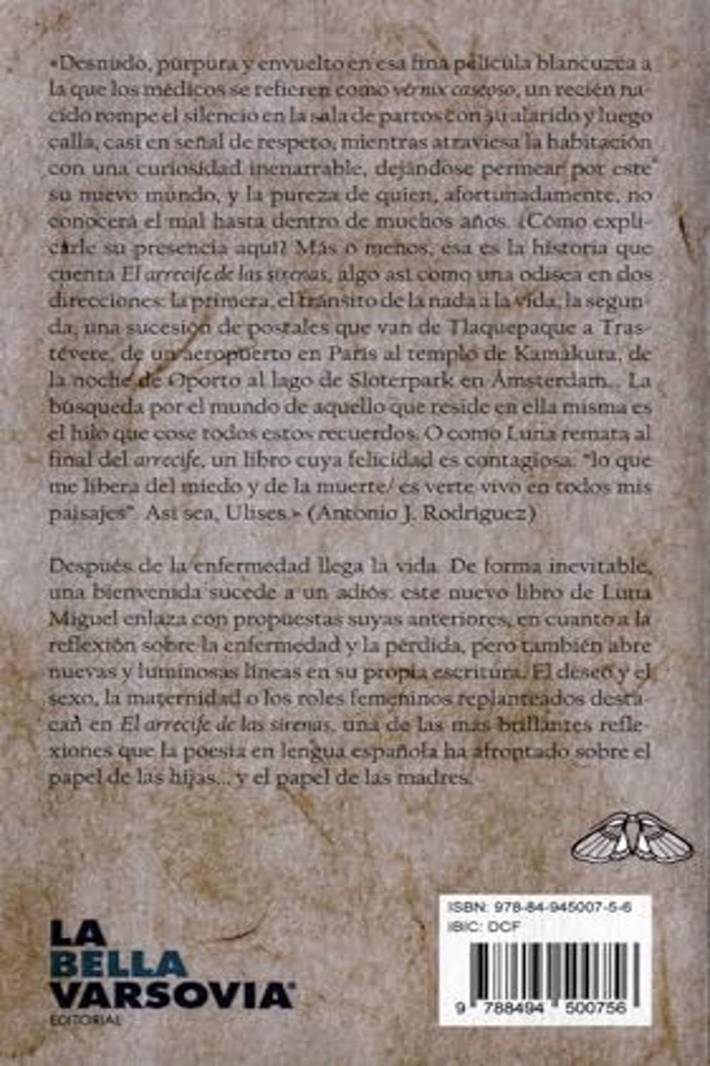 Descripción: Desnudo, púrpura y envuelto en esa fina película blancuzca a la que los médicos se refieren como vérnix caseoso, un recién nacido rompe el silencio en la sala de partos con su alarido y luego calla, casi en señal de respeto, mientras atraviesa la habitación con una curiosidad inenarrable, dejándose permear por este su nuevo mundo, y la pureza de quien, afortunadamente, no conocerá el mal hasta dentro de muchos años. ¿Cómo explicarle su presencia aquí? Más o menos, esa es la historia que cuenta El arrecife de las sirenas, algo así como una odisea en dos direcciones: la primera, el tránsito de la nada a la vida; la segunda, una sucesión de postales que van de Tlaquepaque a Trastévere, de un aeropuerto en París al templo de Kamakura, de la noche de Oporto al lago de Sloterpark en Ámsterdam... La búsqueda por el mundo de aquello que reside en ella misma es el hilo que cose todos estos recuerdos. O como Luna remata al final del arrecife, un libro cuya felicidad es contagiosa: «lo que me libera del miedo y de la muerte / es verte vivo en todos mis paisajes». Así sea, Ulises (Antonio J. Rodríguez).