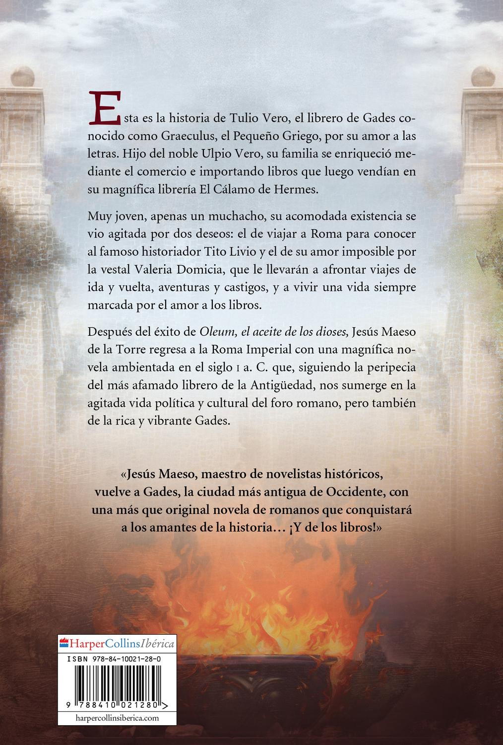 Descripción: Esta es la historia de Tulio Vero, el librero de Gades conocido como Graeculus, el Pequeño Griego, por su amor a las letras. Hijo del noble Ulpio Vero, uno de los Quinientos Caballeros de Gades, su familia se enriqueció mediante el comercio del oleum, el vino, maderas nobles y cuero a Roma, y de allí importando libros que luego vendían en Hispania. Muy joven, apenas un muchacho, su acomodada existencia se vio agitada por dos deseos: el de viajar a Roma para conocer al famoso historiador Tito Livio y el de su amor imposible por la vestal Valeria Domicia, que le llevarán a afrontar viajes de ida y vuelta, aventuras y castigos, y a vivir una vida siempre marcada por el amor a los libros. Después del éxito de Oleum, el aceite de los dioses, Jesús Maeso de la Torre regresa a la Roma Imperial con una magnífica novela ambientada a caballo entre el siglo I d. C. que, siguiendo la peripecia del más afamado librero de la Antigüedad, nos sumerge en la agitada política y cultural del foro romano, pero también de la rica y vibrante Gades. Jesús Maeso, maestro de novelistas históricos, vuelve a Gades, la ciudad más antigua de Occidente, con una más que original novela de romanos que conquistará a los amantes de la historia… ¡Y de los libros!»