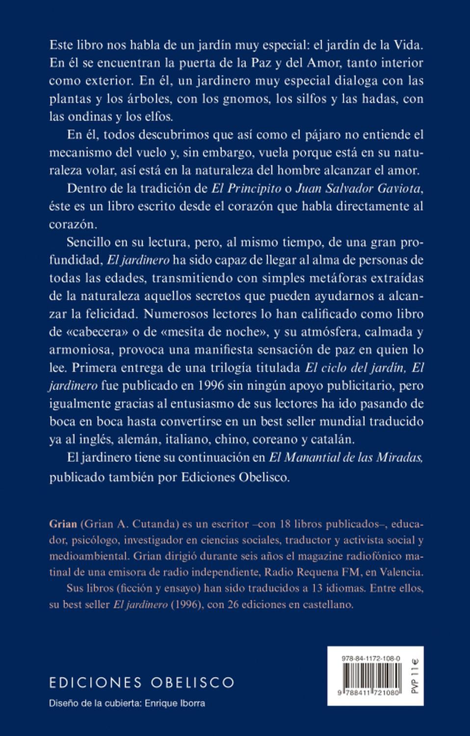 Descripción: Este libro nos habla de un jardín muy especial: el Jardín de la Vida. En él se encuentran la puerta de la Paz y del Amor, tanto interior como exterior. En él un jardinero muy especial dialoga con las plantas y los árboles, con los gnomos, los silfos y las hadas, con las ondinas y los elfos. En él todos descubrimos que, así como el pájaro no entiende el mecanismo del vuelo y sin embargo vuela porque está en su naturaleza volar, así está en la naturaleza del hombre alcanzar el amor. Dentro de la tradición de El Principito o Juan Salvador Gaviota, éste es un libro escrito desde el corazón que habla directamente al corazón. Primera entrega de una trilogía titulada El ciclo del jardín, El jardinero fue publicado en 1996 sin ningún apoyo publicitario, pero igualmente gracias al entusiasmo de sus lectores ha ido pasando de boca en boca hasta convertirse en un best seller mundial traducido ya a 11 idiomas, entre ellos inglés, alemán, italiano, chino, coreano y catalán. El jardinero tiene su continuación en El Manantial de las Miradas y Retorno al jardín, publicados también por Ediciones Obelisco.