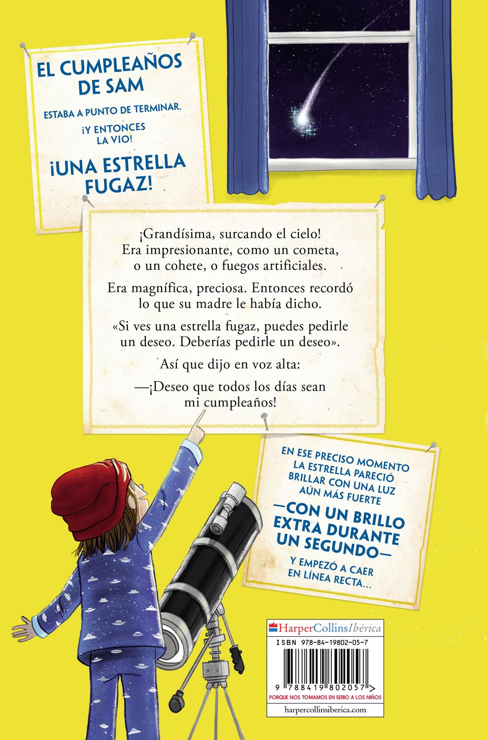 Descripción: Sam Green tiene muchísimas, pero muchísimas, muchísimas, muchísimas, muchísimas, muchísimas, muchísimas, muchísimas, muchísimas, muchísimas, muchísimas, muchísimas, muchísimas ganas de que llegue el día de su undécimo cumpleaños. O sea, muchísimas. Está impaciente. De hecho, desearía que todos los días fueran su cumpleaños. El cumpleaños de Sam estaba a punto de terminar. ¡y entonces la vio! ¡una estrella fugaz! ¡Grandísima, surcando el cielo! Era impresionante, como un cometa, o un cohete, o fuegos artificiales. Era magnífica, preciosa. Entonces recordó lo que su madre le había dicho. Si ves una estrella fugaz, puedes pedirle un deseo. Deberías pedirle un deseo. Así que dijo en voz alta: —¡Deseo que todos los días sean mi cumpleaños! En ese preciso momento la estrella pareció brillar con una luz aún más fuerte –con un brillo extra durante un segundo– y empezó a caer en línea recta… Así que, al principio, le hace muchísima ilusión que el día siguiente también sea su cumpleaños. Y el siguiente. Y el siguiente. Pero a veces hay que tener cuidado con los deseos que se piden…