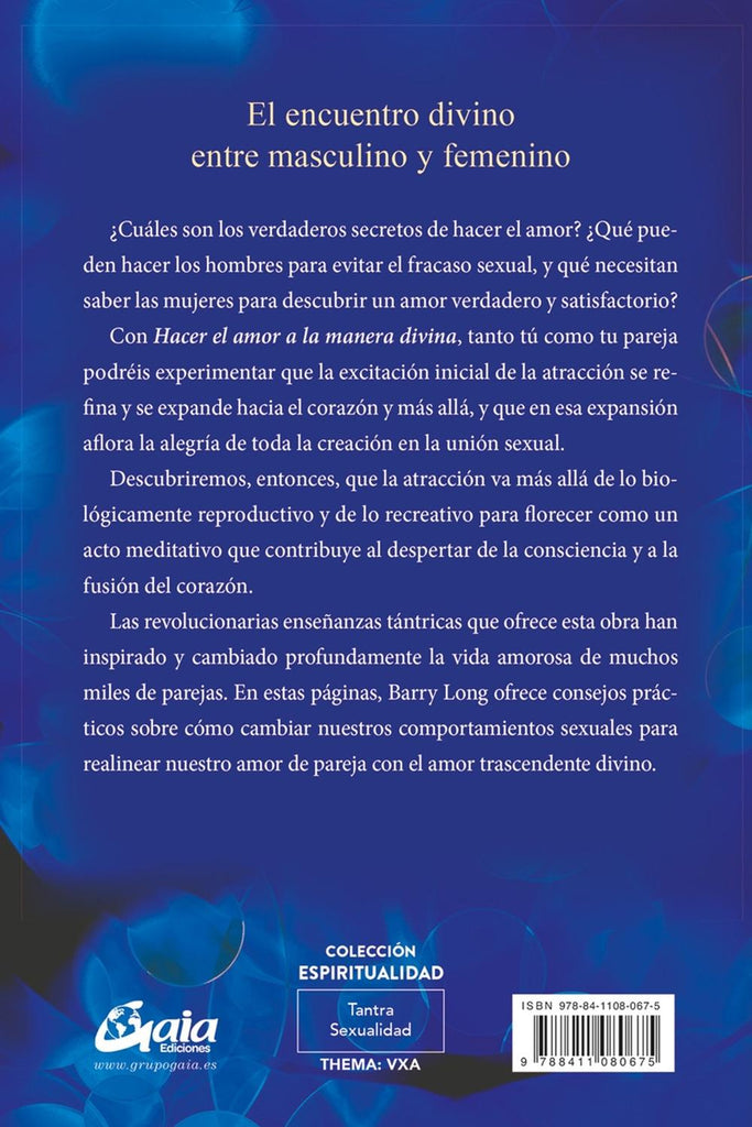 Descripción: El encuentro divino entre masculino y femenino. ¿Cuáles son los verdaderos secretos de hacer el amor? ¿Qué pueden hacer los hombres para evitar el fracaso sexual, y qué necesitan saber las mujeres para descubrir un amor verdadero y satisfactorio? Con Hacer el amor a la manera divina, tanto tú como tu pareja podréis experimentar que la excitación inicial de la atracción se refina y se expande hacia el corazón y más allá, y que en esa expansión aflora la alegría de toda la creación en la unión sexual. Descubriremos, entonces, que la atracción va más allá de lo biológicamente reproductivo y de lo recreativo para florecer como un acto meditativo que contribuye al despertar de la consciencia y a la fusión del corazón. Las revolucionarias enseñanzas tántricas que ofrece esta obra han inspirado y cambiado profundamente la vida amorosa de muchas de miles de parejas.