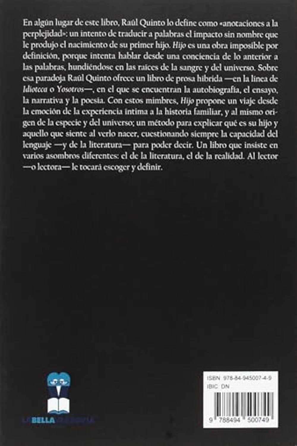 Descripción: En algún lugar de este libro, Raúl Quinto lo define como «anotaciones a la perplejidad»: un intento de traducir a palabras el impacto sin nombre que le produjo el nacimiento de su primer hijo. Hijo es una obra imposible por definición, porque intenta hablar desde una conciencia de lo anterior a las palabras, hundiéndose en las raíces de la sangre y del universo. Sobre esa paradoja Raúl Quinto ofrece un libro de prosa híbrida —en la línea de Idioteca o Yosotros— en el que se encuentran la autobiografía, el ensayo, la narrativa y la poesía. Con estos mimbres, Hijo propone un viaje desde la emoción de la experiencia íntima a la historia familiar, y al mismo origen de la especie y del universo; un método para explicar qué es su hijo y aquello que siente al verlo nacer, cuestionando siempre la capacidad del lenguaje —y de la literatura— para poder decir. Un libro que insiste en varios asombros diferentes: el de la literatura, el de la realidad. Al lector o lectora le tocará escoger y definir.