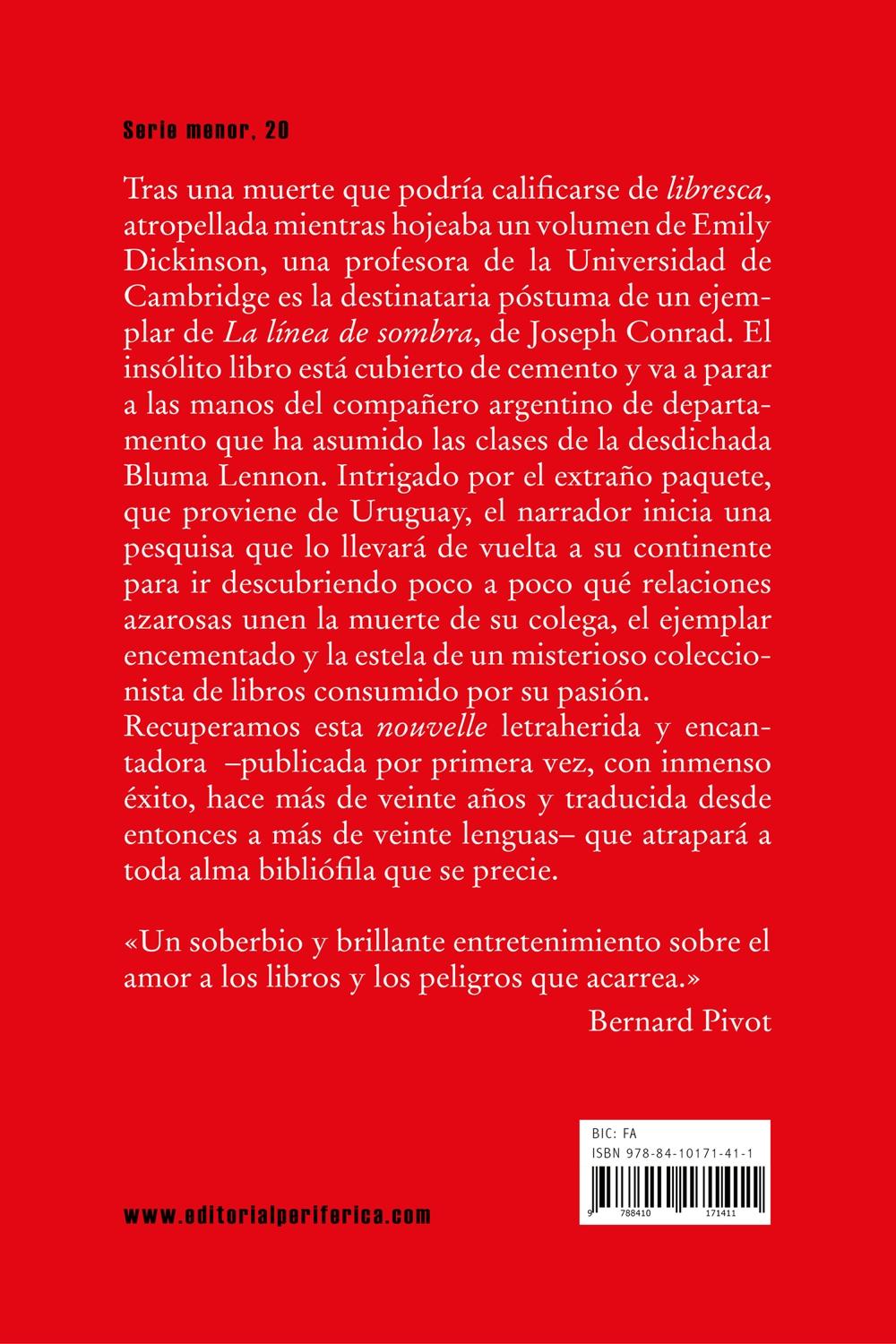 Descripción: Tras una muerte que podría calificarse de libresca, atropellada mientras hojeaba un volumen de Emily Dickinson, una profesora de la Universidad de Cambridge es la destinataria póstuma de un ejemplar de La línea de sombra, de Joseph Conrad. El insólito libro está cubierto de cemento y va a parar a las manos del compañero argentino de departamento que ha asumido las clases de la desdichada Bluma Lennon. Intrigado por el extraño paquete, que proviene de Uruguay, el narrador inicia una pesquisa que lo llevará de vuelta a su continente para ir descubriendo poco a poco qué relaciones azarosas unen la muerte de su colega, el ejemplar encementado y la estela de un misterioso coleccionista de libros consumido por su pasión. Recuperamos esta nouvelle letraherida y encantadora publicada por primera vez, con inmenso éxito, hace más de veinte años y traducida desde entonces a más de veinte lenguas que atrapará a toda alma bibliófila que se precie.