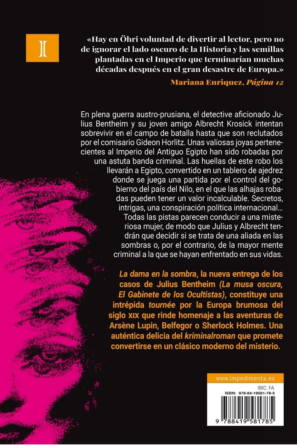 Descripción: En plena guerra austro-prusiana, el detective aficionado Julius Bentheim y su joven amigo Albrecht Krosick intentan sobrevivir en el campo de batalla hasta que son reclutados por el comisario Gideon Horlitz. Unas valiosas joyas pertenecientes al Imperio del Antiguo Egipto han sido robadas por una astuta banda criminal. Las huellas de este robo los llevarán a Egipto, convertido en un tablero de ajedrez donde se juega una partida por el control del gobierno del país del Nilo, en el que las alhajas robadas pueden tener un valor incalculable. Secretos, intrigas, una conspiración política internacional. . . Todas las pistas parecen conducir a una misteriosa mujer, de modo que Julius y Albrecht tendrán que decidir si se trata de una aliada en las sombras o, por el contrario, de la mayor mente criminal a la que se hayan enfrentado en sus vidas.