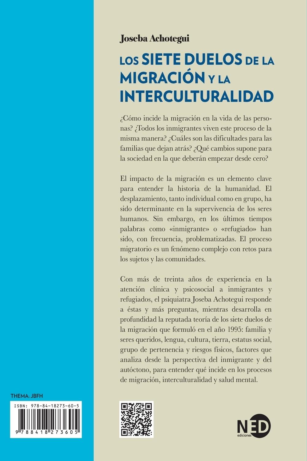 Descripción: El libro desarrolla el modelo de los siete duelos de la migración: familia y seres queridos, lengua, cultura, tierra, grupo de pertenencia y riesgos físicos. Aborda el estrés y el duelo migratorio desde un punto de vista muy amplio, que va desde la biología que incluye los conocimientos genéticos y la biología molecular hasta la biopolítica o los estudios culturales con relación al modelo social en el que se integran los inmigrantes, o los estudios poscoloniales, y profundizando por supuesto, en los planteamientos psicológicos relacionados con la expresión y la elaboración del estrés y el duelo migratorio. Se plantea no sólo la perspectiva del inmigrante que vive los duelos de la migración, sino también la mirada de la sociedad de acogida. La migración es un fenómeno social, un hecho que afecta a toda la sociedad, tanto al inmigrante como al autóctono que ve modificado su mundo por la llegada de los inmigrantes, como a los familiares que quedan en el país de origen.