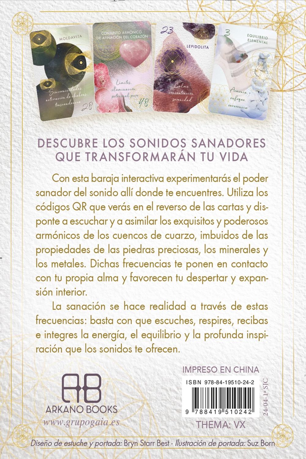 Descripción: Descubre los sonidos sanadores que transformarán tu vida. Con esta baraja interactiva experimentarás el poder sanador del sonido allí donde te encuentres. Utiliza los códigos QR que verás en el reverso de las cartas y disponte a escuchar y a asimilar los exquisitos y poderosos armónicos de los cuencos de cuarzo, imbuidos de las propiedades de las piedras preciosas, los minerales y los metales. Dichas frecuencias te ponen en contacto con tu propia alma y favorecen tu despertar y expansión interior. La sanación se hace realidad a través de estas frecuencias: basta con que escuches, respires, recibas e integres la energía, el equilibrio y la profunda inspiración que los sonidos te ofrecen.