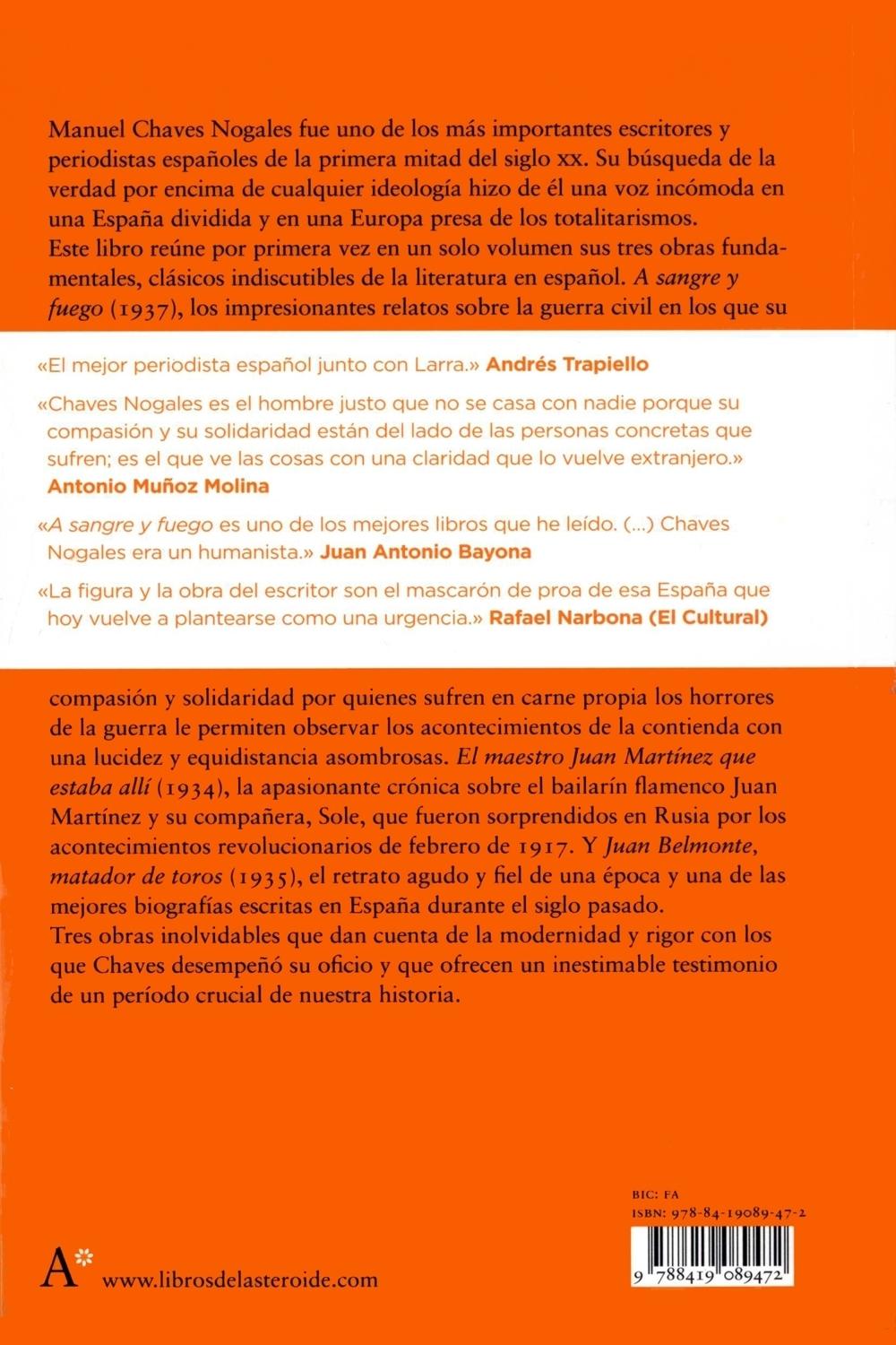 Descripción: Las tres obras imprescindibles de Manuel Chaves Nogales reunidas en un solo volumen. Tres clásicos indiscutibles de la literatura española del siglo XX. Manuel Chaves Nogales fue uno de los más importantes escritores y periodistas españoles de la primera mitad del siglo XX. Su búsqueda de la verdad por encima de cualquier ideología hizo de él una voz incómoda en una España dividida y en una Europa presa de los totalitarismos. Este libro reúne por primera vez en un solo volumen sus tres obras fundamentales, clásicos indiscutibles de la literatura en español. A sangre y fuego (1937), los impresionantes relatos sobre la guerra civil en los que su compasión y solidaridad por quienes sufren en carne propia los horrores de la guerra le permiten observar los acontecimientos de la contienda con una lucidez y equidistancia asombrosas.