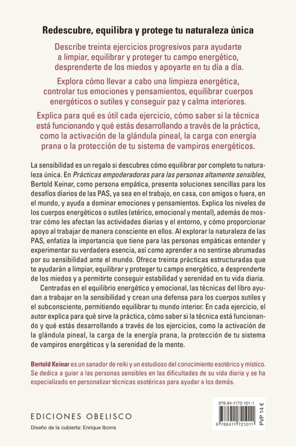 Descripción: Redescubre, equilibra y protege tu naturaleza única • Describe treinta ejercicios progresivos para ayudarte a limpiar, equilibrar y proteger tu campo energético, desprenderte de los miedos y apoyarte en tu día a día. • Explora cómo llevar a cabo una limpieza energética, controlar tus emociones y pensamientos, equilibrar cuerpos energéticos o sutiles y conseguir paz y calma interiores. • Explica para qué es útil cada ejercicio, cómo saber si la técnica está funcionando y qué estás desarrollando a través de la práctica, como la activación de la glándula pineal, la carga con energía prana o la protección de tu sistema de vampiros energéticos. La sensibilidad es un regalo si descubres cómo equilibrar por completo tu naturaleza única. En Prácticas empoderadoras para las personas altamente sensibles, Bertold Keinar, como persona empática, presenta soluciones sencillas para los desafíos diarios de las PAS, ya sea en el trabajo, en casa, con amigos o fuera, en el mundo, y ayuda a dominar emociones y pensamientos. Explica los niveles de los cuerpos energéticos o sutiles (etérico, emocional y mental), además de mostrar cómo les afectan las actividades diarias y el entorno, y cómo proporcionar apoyo al trabajar de manera consciente en ellos.