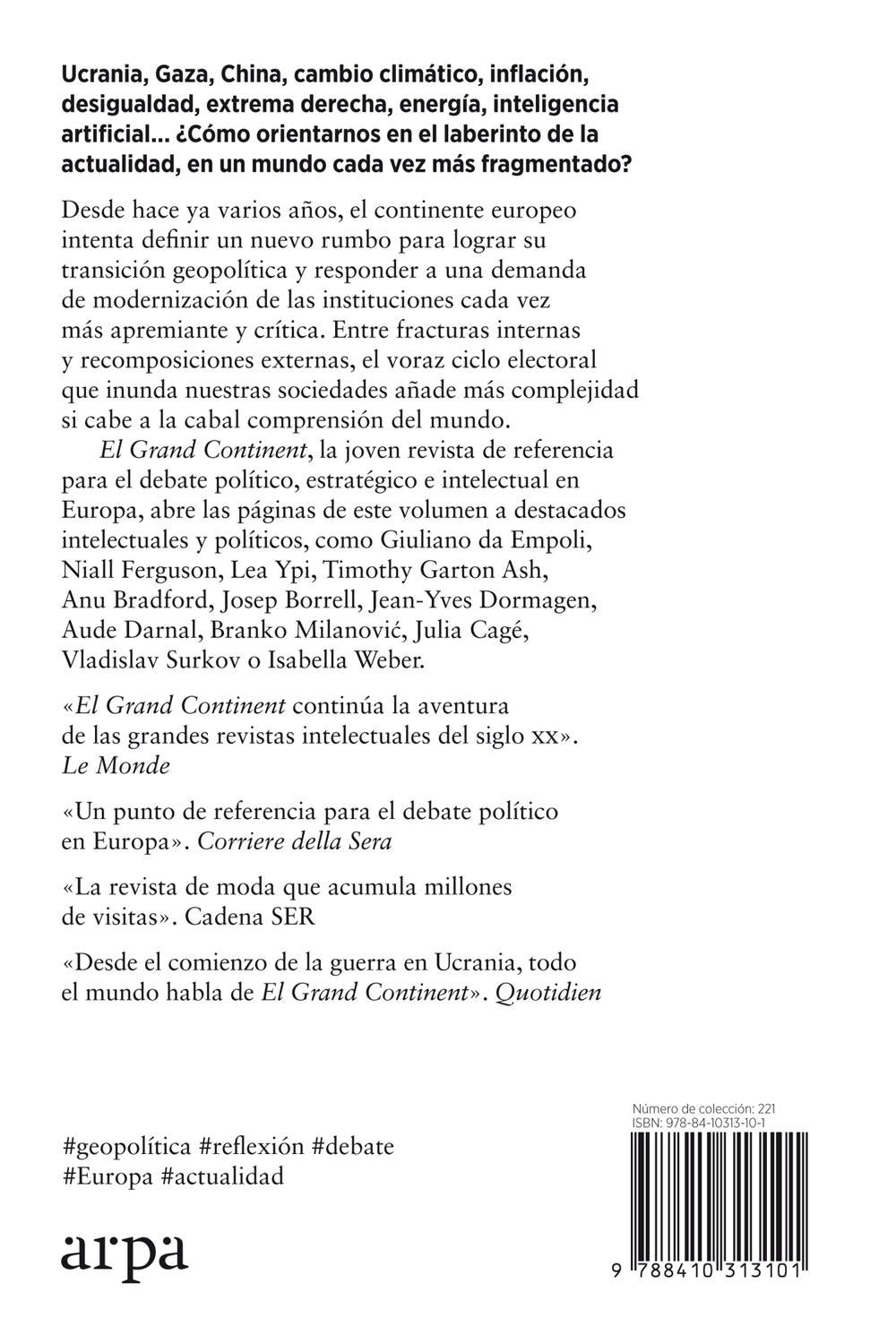 Descripción: Ucrania, Gaza, China, cambio climático, inflación, desigualdad, extrema derecha, energía, inteligencia artificial... ¿Cómo orientarnos en el laberinto de la actualidad, en un mundo cada vez más fragmentado? Desde hace ya varios años, el continente europeo intenta definir un nuevo rumbo para lograr su transición geopolítica y responder a una demanda de modernización de las instituciones cada vez más apremiante y crítica. Entre fracturas internas y recomposiciones externas, el voraz ciclo electoral que inunda nuestras sociedades añade más complejidad si cabe a la cabal comprensión del mundo. El Grand Continent, la joven revista de referencia para el debate político, estratégico e intelectual en Europa, abre las páginas de este volumen a destacados intelectuales y políticos, como Giuliano da Empoli, Niall Ferguson, Lea Ypi, Timothy Garton Ash, Anu Bradford, Josep Borrell, Jean-Yves Dormagen, Aude Darnal, Branko Milanović, Julia Cagé, Vladislav Surkov o Isabella Weber.
