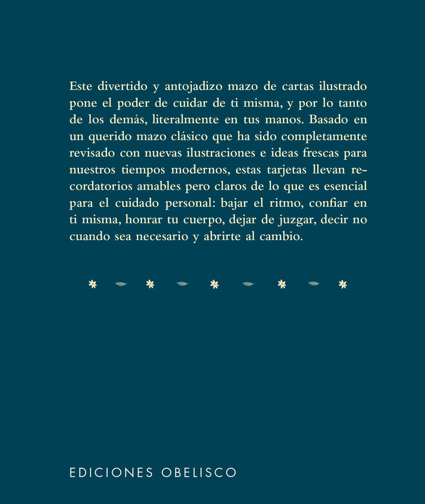 Descripción: Este divertido y fantástico mazo de cartas ilustrado pone el poder de cuidar de ti misma, y por lo tanto de los demás, literalmente en tus manos. Basado en un apreciado mazo clásico que ha sido completamente revisado con nuevas ilustraciones e ideas frescas para nuestros tiempos modernos, estas tarjetas llevan recordatorios amables pero claros de lo que es esencial para el cuidado personal: bajar el ritmo, confiar en ti misma, honrar tu cuerpo, dejar de juzgar, decir no cuando sea necesario y abrirte al cambio.