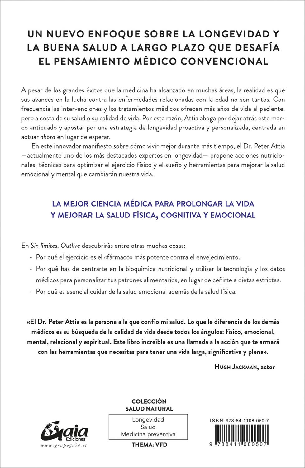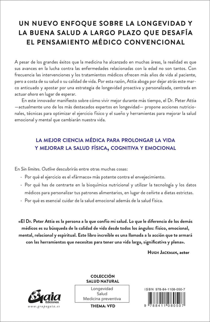 Descripción: A pesar de los grandes éxitos que la medicina ha alcanzado en muchas áreas, la realidad es que sus avances en la lucha contra las enfermedades relacionadas con la edad no son tantos. Con frecuencia las intervenciones y los tratamientos médicos ofrecen más años de vida al paciente, pero a costa de su salud o su calidad de vida. Por esta razón, Attia aboga por dejar atrás este marco anticuado y apostar por una estrategia de longevidad proactiva y personalizada, centrada en actuar ahora en lugar de esperar. En este innovador manifiesto sobre cómo vivir mejor durante más tiempo, el Dr. Peter Attia —actualmente uno de los más destacados expertos en longevidad— propone acciones nutricionales, técnicas para optimizar el ejercicio físico y el sueño y herramientas para mejorar la salud emocional y mental que cambiarán nuestra vida.