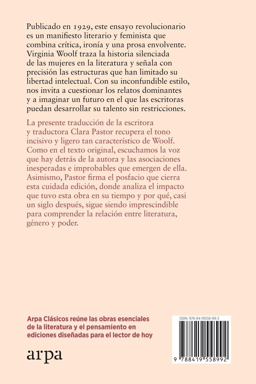 Descripción: Publicado en 1929, este ensayo revolucionario es un manifiesto literario y feminista que combina crítica, ironía y una prosa envolvente. Virginia Woolf traza la historia silenciada de las mujeres en la literatura y señala con precisión las estructuras que han limitado su libertad intelectual. Con su inconfundible estilo, nos invita a cuestionar los relatos dominantes y a imaginar un futuro en el que las escritoras puedan desarrollar su talento sin restricciones. La presente traducción de la escritora y traductora Clara Pastor recupera el tono incisivo y ligero tan característico de Woolf. Como en el texto original, escuchamos la voz que hay detrás de la autora y las asociaciones inesperadas e improbables que emergen de ella. Asimismo, Pastor firma el posfacio que cierra esta cuidada edición, donde analiza el impacto que tuvo esta obra en su tiempo y por qué, casi un siglo después, sigue siendo imprescindible para comprender la relación entre literatura, género y poder.