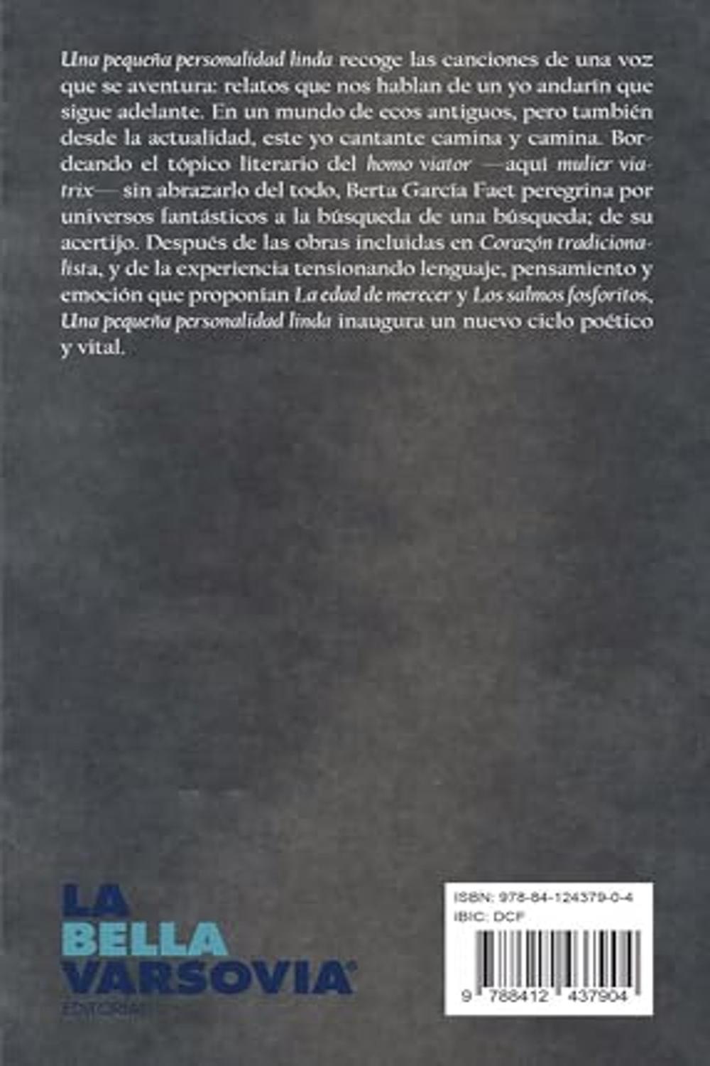 Descripción: Una pequeña personalidad linda recoge las canciones de una voz que se aventura: relatos que nos hablan de un yo andarín que sigue adelante. En un mundo de ecos antiguos, pero también desde la actualidad, este yo cantante camina y camina. Bordeando el tópico literario del Homo Viator aquí, sin abrazarlo del todo, Berta García Faet peregrina por universos fantásticos a la búsqueda de una búsqueda; de su acertijo. Después de las obras incluidas en Corazón tradicionalista, y de la experiencia tensionando lenguaje, pensamiento y emoción que proponían La edad de merecer y Los salmos fosforitos, Una pequeña personalidad linda inaugura un nuevo ciclo poético y vital.