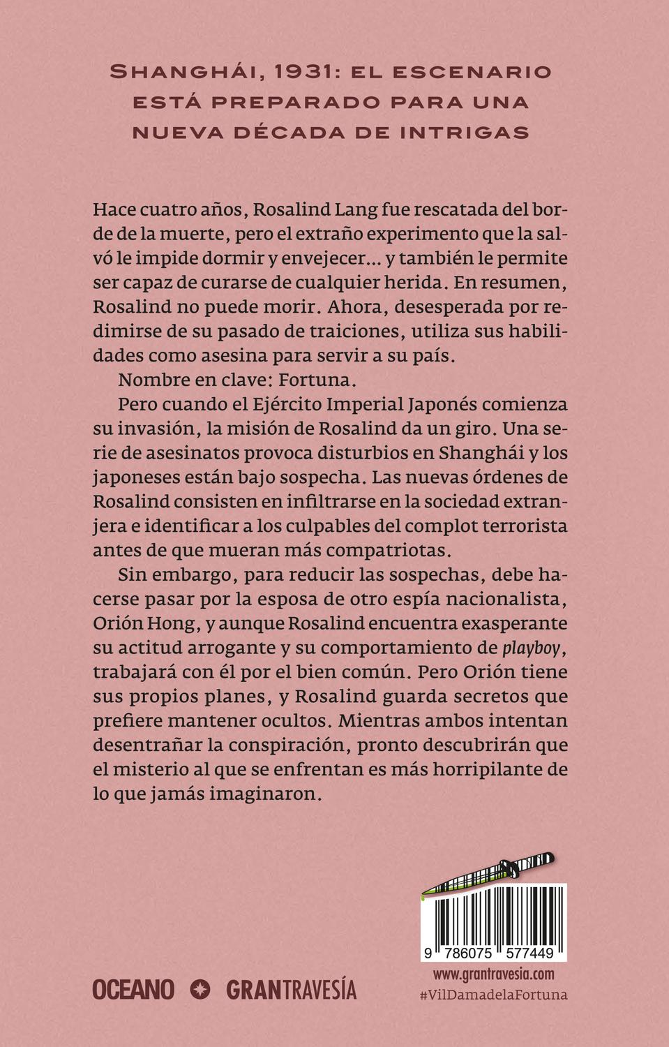 Descripción: La nueva bilogía de la exitosa autora de Placeres violentos. Shanghái 1931: el escenario está preparado para una nueva década de intrigas. Hace cuatro años, Rosalind Lang fue rescatada del borde de la muerte, pero el extraño experimento que la salvó le impide dormir y envejecer, y también le permite ser capaz de curarse de cualquier herida. En resumen, Rosalind no puede morir. Ahora, desesperada por redimirse de su pasado traidor, utiliza sus habilidades como asesina para servir a su país. Nombre en clave: Fortuna. Pero cuando el Ejército Imperial Japonés comienza su invasión, la misión de Rosalind da un giro. Las nuevas órdenes de Rosalind consisten en infiltrarse en la sociedad extranjera e identificar a los culpables del complot terrorista antes de que mueran más compatriotas suyos.