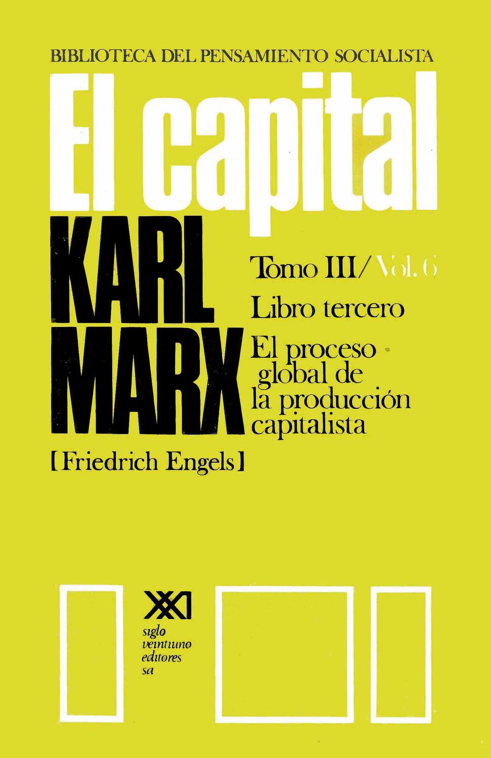 Tomo 1 (libro primero): El proceso de producción del capital. Vol. 1: Sección primera, Mercancía y dinero; sección segunda, La trasformación de dinero en capital; sección tercera, La producción del plus valor absoluto. Vol. 2: Sección cuarta, La producción del plusvalor relativo; sección quinta, La producción del plusvalor absoluto y relativo; sección sexta, El salario Vol. 3: Sección séptima, El proceso de acumulación del capital. Este volumen contiene además un apéndice con la redacción del capítulo 1 ("La mercancía") tal como figuró en la primera edición y con el trabajo "La forma de valor", redactado por Marx para dicha edición e incorporado al final del libro como texto complementario y aclaratorio del análisis de la mercancía y el dinero. Se agregan asimismo más de trescientas notas del editor (referencias bibliográficas, texto original de citas, breves explicaciones, etc.), índice analítico, de nombres y de obras citadas.