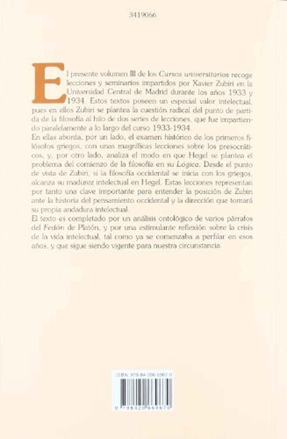 El volumen III de los "Cursos Universitarios" recoge lecciones y seminarios impartidos por Xavier Zubiri en la Universidad Central de Madrid durante los años 1933 y 1934. Estos textos poseen un especial valor intelectual, pues en ellos Zubiri se plantea la cuestión radical del punto de partida de la filosofía al hilo de dos series de lecciones, que fue impartiendo paralelamente a lo largo del curso 1933-1934. En ellas aborda, por un lado, el examen histórico de los primeros filósofos griegos, con unas magníficas lecciones sobre los presocráticos y, por otro lado, analiza el modo en que Hegel se plantea el problema del comienzo de la filosofía en su Lógica. Desde el punto de vista de Zubiri, si la filosofía occidental se inicia con los griegos, alcanza su madurez intelectual en Hegel. Estas lecciones representan por tanto una clave importante para entender la posición de Zubiri ante la historia del pensamiento occidental y la dirección que tomará su propia andadura intelectual. El texto es completado por un análisis ontológico de varios párrafos del "Fedón" de Platón, y por una estimulante reflexión sobre la crisis de la vida intelectual, tal como ya se comenzaba a perfilar en esos años, y que sigue siendo vigente para nuestra circunstancia.