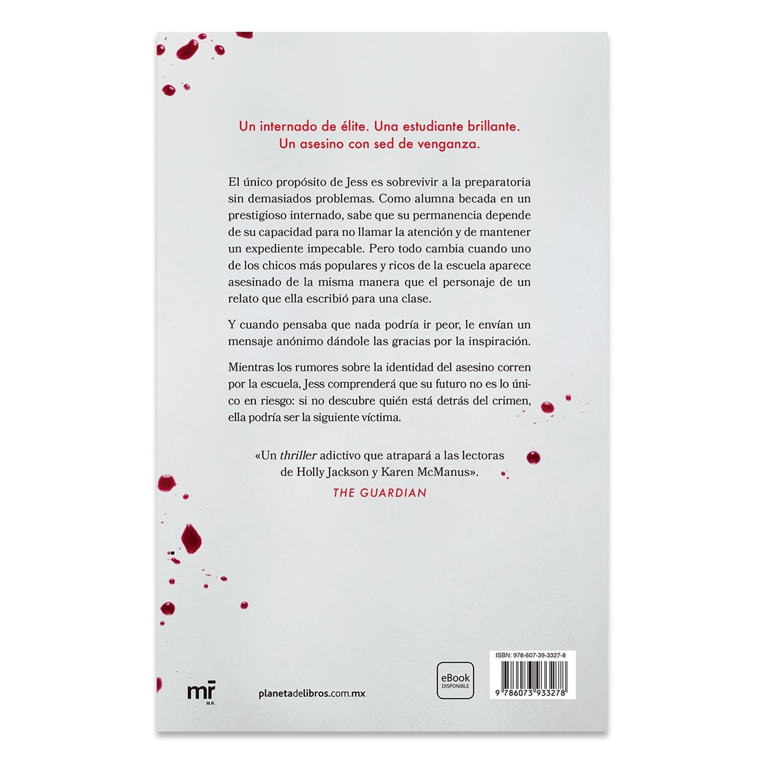 Descripción: Cuando Jess escribió un relato de misterio para clase, jamás pensó que alguien en su escuela llevaría el crimen a la vida real. Ahora ella podría ser la próxima víctima. Un thriller trepidante para lectoras de Holly Jackson y Karen McManus. El único propósito de Jess es sobrevivir al instituto sin demasiados problemas. Como alumna becada en una prestigiosa escuela, sabe que su permanencia depende de su capacidad para no llamar la atención y mantener un expediente impecable. Pero todo cambia cuando uno de los chicos más populares y ricos del instituto aparece muerto de la misma manera que un personaje de un relato que escribió para clase. Cuando parece que nada podría ir peor, recibe un mensaje anónimo dándole las gracias por la inspiración. Mientras los rumores sobre la identidad del asesino corren por el colegio, Jess comprenderá que su futuro no es lo único en riesgo: si no descubre quién está detrás del crimen, ella podría ser la siguiente víctima. El debut de thriller juvenil más vendido del año en Reino Unido. «Un thriller adictivo que atrapará a las lectoras de Holly Jackson y Karen McManus» The Guardian