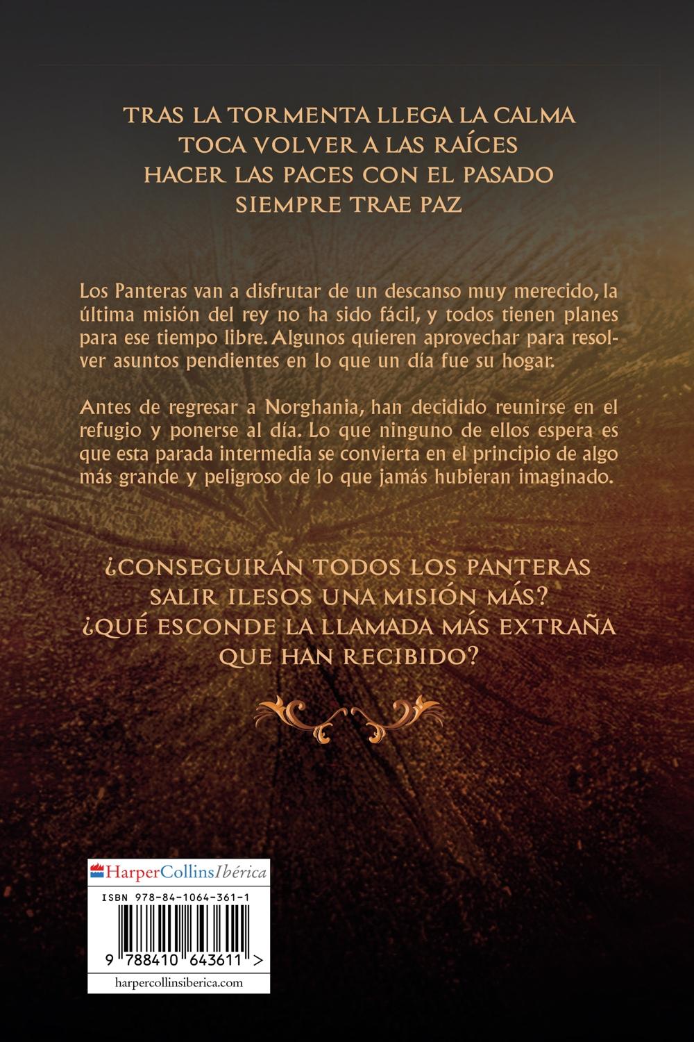 Descripción: Los Panteras van a disfrutar de un descanso muy merecido, la última misión del rey no ha sido fácil, y todos tienen planes para ese tiempo libre. Algunos van a aprovechar para resolver asuntos pendientes en lo que un día fue su hogar. Antes de regresar a Norghana, han decidido reunirse en el refugio y ponerse al día. Lo que ninguno de ellos espera es que está parada intermedia se convierta en el principio de algo más grande y peligroso de lo que jamás hubieran imaginado. ¿Conseguirán todos los Panteras salir ilesos una misión más? ¿Qué se esconde tras la llamada más extraña que han recibido?