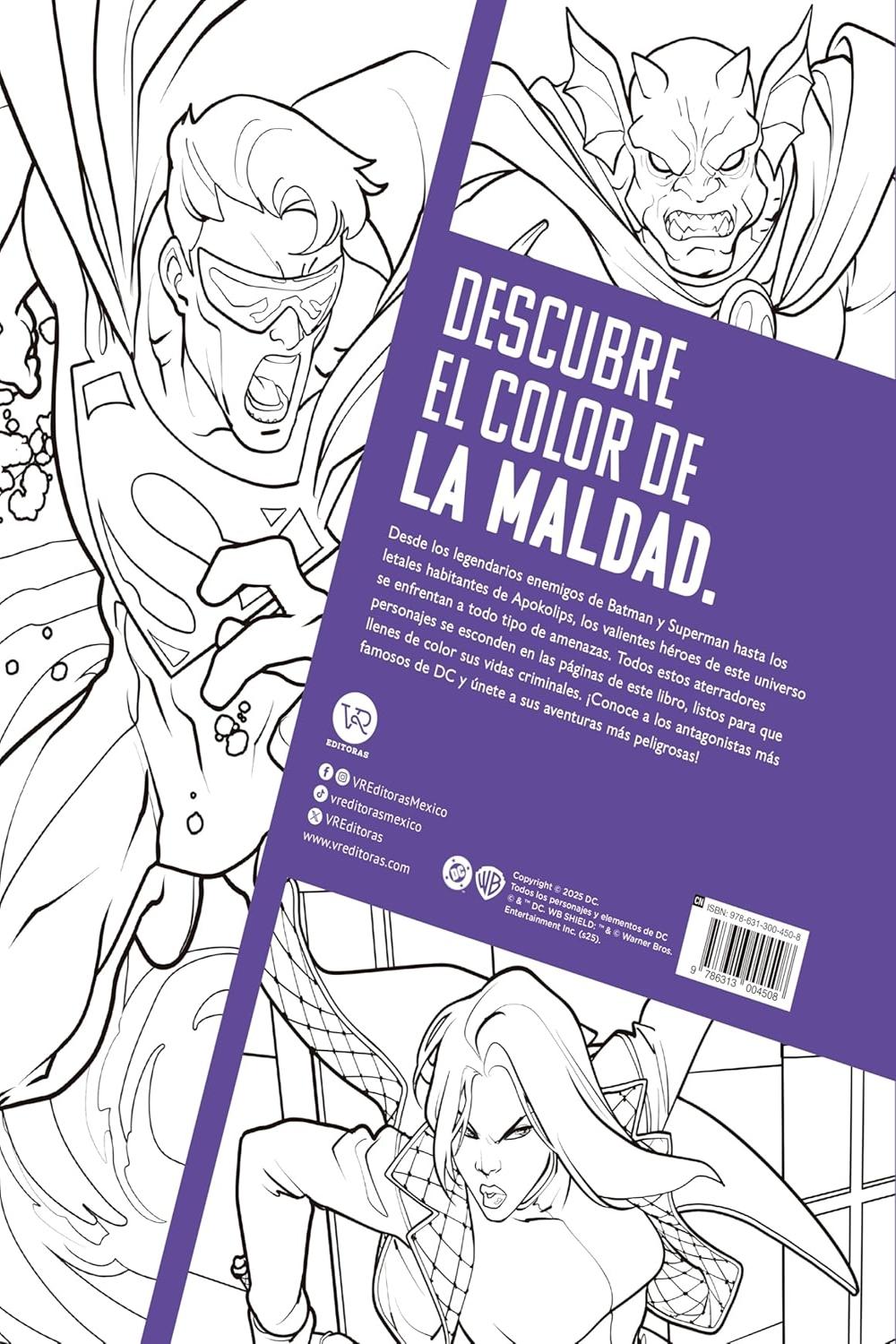 Descripción: DESCUBRE EL COLOR DE LA MALDAD. Desde los legendarios enemigos de Batman y Superman hasta los letales habitantes de Apokolips, los valientes héroes de este universo se enfrentan a todo tipo de amenazas. Todos estos aterradores personajes se esconden en las páginas de este libro, listos para que llenes de color sus vidas criminales. ¡Conoce a los antagonistas más famosos de DC y únete a sus aventuras más peliosas!