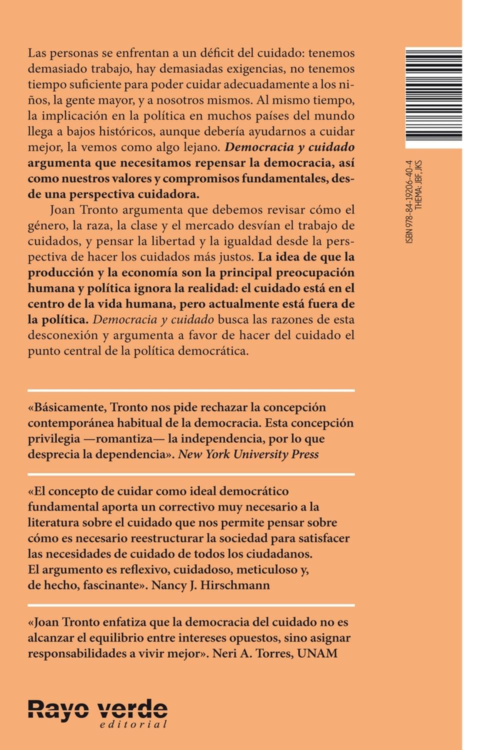 Descripción: Mercados, igualdad y justicia. El cuidado en el centro de la vida humana. Las personas se enfrentan a un déficit del cuidado: tenemos demasiado trabajo, hay demasiadas exigencias, no tenemos tiempo suficiente para poder cuidar adecuadamente a los niños, la gente mayor, y a nosotros mismos. Al mismo tiempo, la implicación en la política en muchos países del mundo llega a bajos históricos, aunque debería ayudarnos a cuidar mejor, la vemos como algo lejano. Democracia y cuidado argumenta que necesitamos repensar la democracia, así como nuestros valores y compromisos fundamentales, desde una perspectiva cuidadora. Joan Tronto argumenta que debemos revisar cómo el género, la raza, la clase y el mercado desvían el trabajo de cuidados, y pensar la libertad y la igualdad desde la perspectiva de hacer los cuidados más justos.