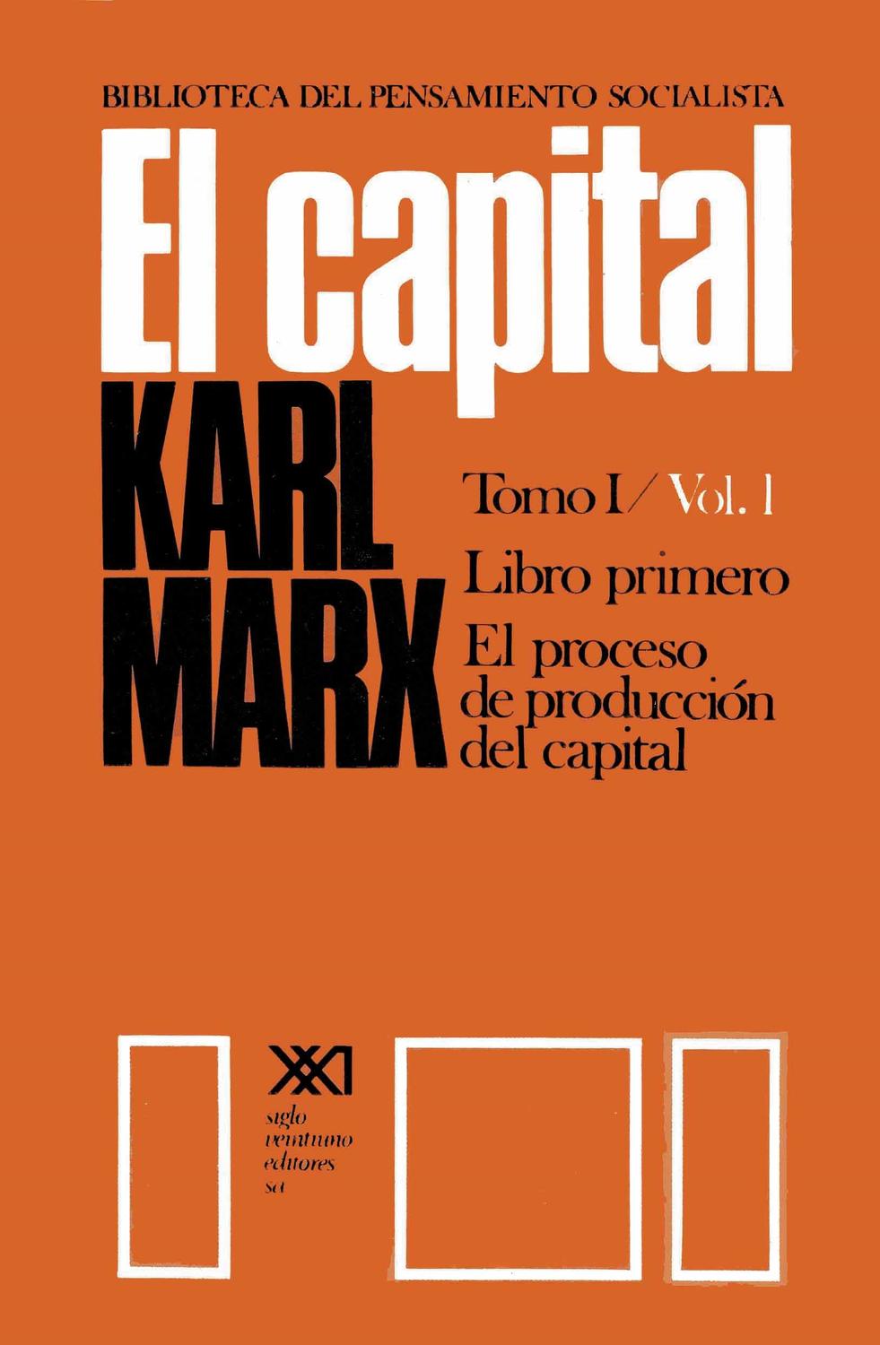 Tomo 1 (libro primero): El proceso de producción del capital. Vol. 1: Sección primera, Mercancía y dinero; sección segunda, La trasformación de dinero en capital; sección tercera, La producción del plusvalor absoluto. Vol. 2: Sección cuarta, La producción del plusvalor relativo; sección quinta, La producción del plusvalor absoluto y relativo; sección sexta, El salario Vol. 3: Sección séptima, El proceso de acumulación del capital. Este volumen contiene además un apéndice con la redacción del capítulo 1 ("La mercancía") tal como figuró en la primera edición y con el trabajo "La forma de valor", redactado por Marx para dicha edición e incorporado al final del libro como texto complementario y aclaratorio del análisis de la mercancía y el dinero. Se agregan asimismo más de trescientas notas del editor (referencias bibliográficas, texto original de citas, breves explicaciones, etc.), índice analítico, de nombres y de obras citadas.