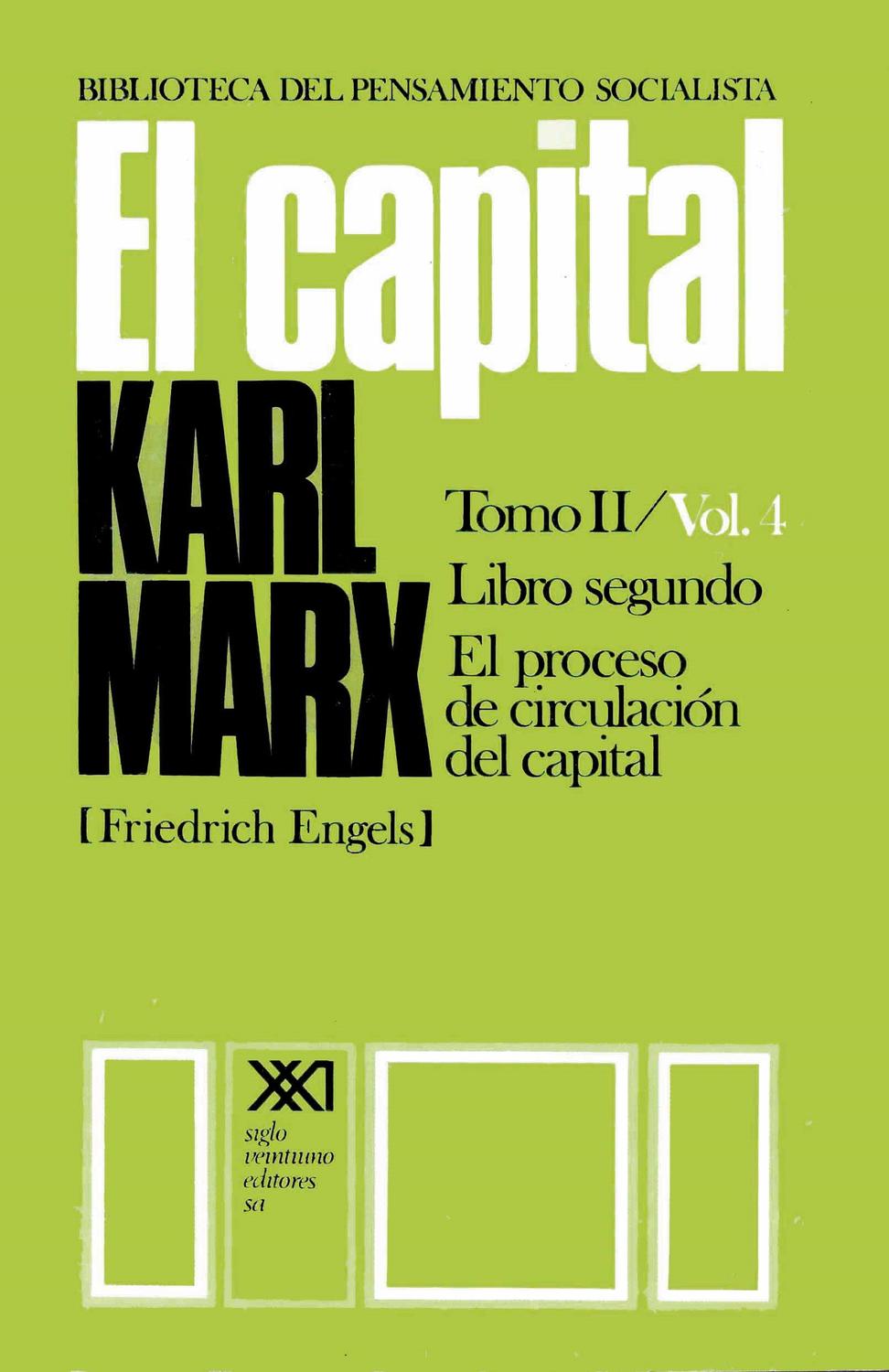 Tomo II (libro segundo): El proceso de circulación del capital. Vol. 4: Sección primera, Las metamorfosis del capital y el ciclo de las mismas, sección segunda, La rotación del capital. Vol. 5: Sección tercera, La reproducción y circulación del capital social global. Se agregan en este volumen notas del editor, Índice analítico, de nombres y de obras citadas.