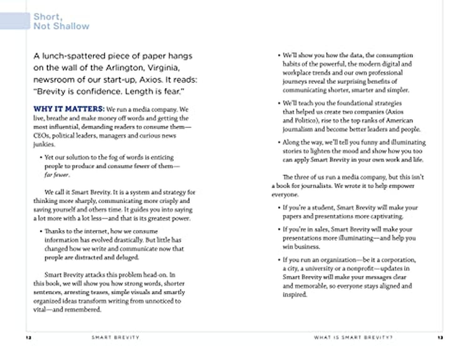 “The writing of Smart Brevity is refreshingly taut and punchy; most of the sentences are finely crafted, short, and to the point, and rip across the page.”