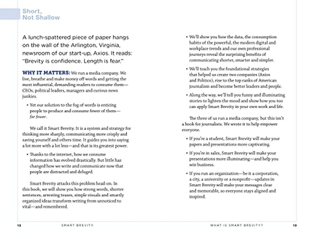 Brevity is confidence. Length is fear. This is the guiding principle of Smart Brevity, a communication formula built by Axios journalists to prioritize essential news and information, explain its impact and deliver it in a concise and visual format. Now, the co-founders of Axios have created an essential guide for communicating effectively and efficiently using Smart Brevity—think Strunk and White’s Elements of Style for the digital age.