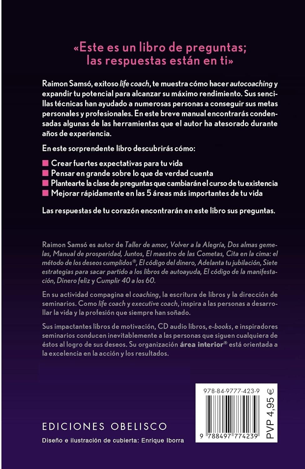 Descripción: «Este es un libro de preguntas; las respuestas están en ti». Raimon Samsó, exitoso life coach, te muestra cómo hacer autocoaching y expandir tu potencial para alcanzar su máximo rendimiento. Sus sencillas técnicas han ayudado a numerosas personas a conseguir sus metas personales y profesionales. En este breve manual encontrarás condensadas algunas de las herramientas que el autor ha atesorado durante años de experiencia. En este sorprendente libro descubrirás cómo: *Crear fuertes expectativas para tu vida *Pensar en grande sobre lo que de verdad cuenta *Plantearte la clase de preguntas que cambiarán el curso de tu existencia *Mejorar rápidamente en las 5 áreas más importantes de tu vida. Las respuestas de tu corazón encontrarán en este libro sus preguntas. RAIMON SAMSÓ es autor de Taller de Amor, Volver a la Alegría, Dos Almas Gemelas, Manual de Prosperidad, Juntos, El Maestro de las Cometas, Cita en la Cima: el método de los deseos cumplidos. En su actividad compagina el coaching, la escritura de libros y la dirección de seminarios. Como life coach y ejecutive coach, inspira a las personas a desarrollar la vida y la profesión que siempre han soñado. Sus impactantes libros de motivación, CD audio libros, e-books, e inspiradores seminarios conducen inevitablemente a las personas que siguen cualquiera de éstos al logro de sus deseos. Su organización área interior está orientada a la excelencia en la acción y los resultados.