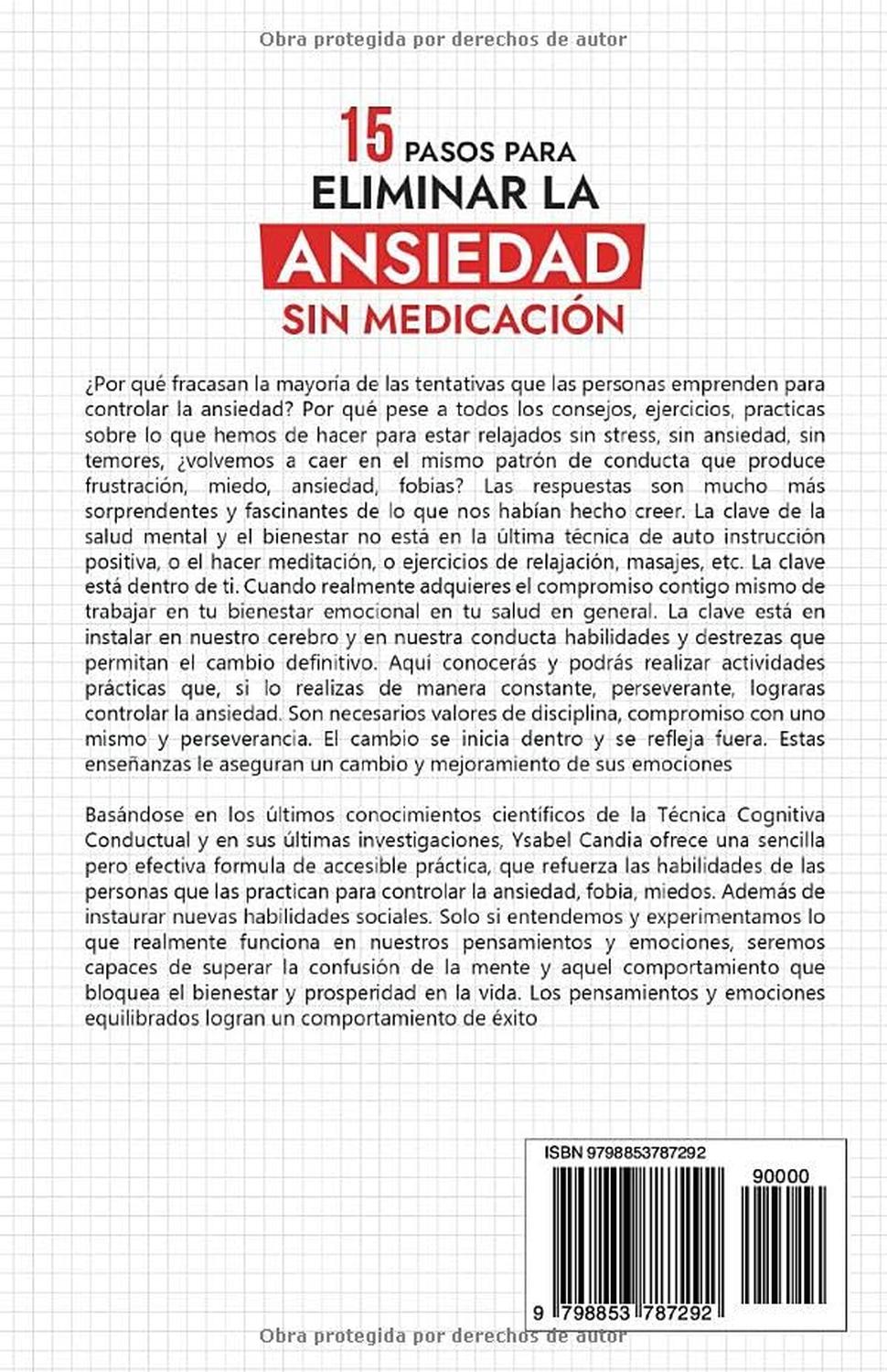 En este libro 15 Pasos para quitar la Ansiedad sin Medicación, estoy compartiendo mi propia experiencia en el camino a la sanación de mis síntomas de ansiedad, baja autoestima y depresión. Son pasos para quitar la ansiedad a través de ejercicios físicos, prácticas de terapia cognitiva conductual, meditación, alimentación saludable y tener un plan de vida para controlar la ansiedad, que a la par le ayudara a una mejor calidad de vida.
