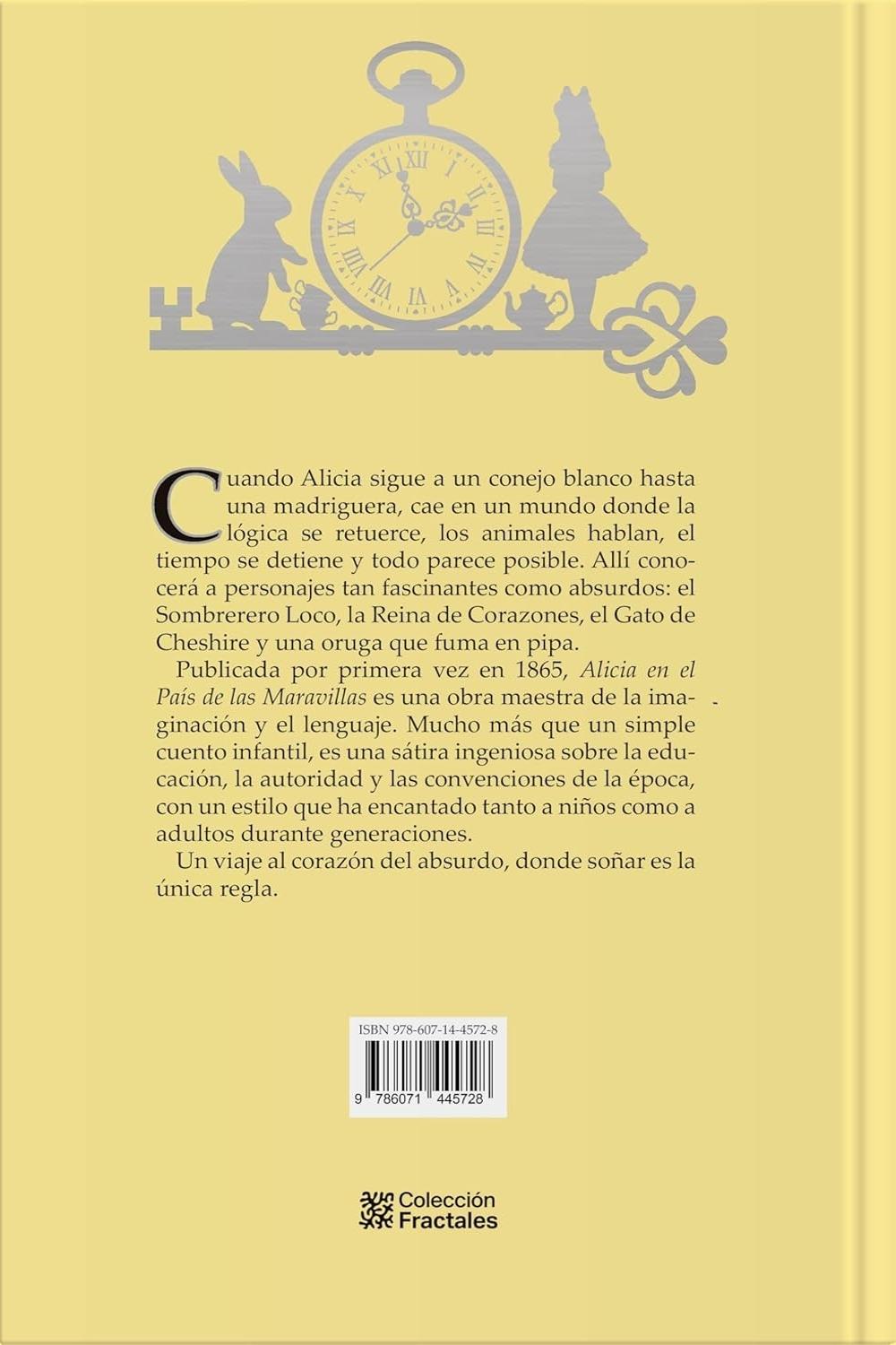 Descripción: Cuando Alicia sigue a un conejo blanco hasta una madriguera, cae en un mundo donde la lógica se retuerce, los animales hablan, el tiempo se detiene y todo parece posible. Allí conocerá a personajes tan fascinantes como absurdos: el Sombrerero Loco, la Reina de Corazones, el Gato de Cheshire y una oruga que fuma en pipa. Publicada por primera vez en 1865, Alicia en el País de las Maravillas es una obra maestra de la imaginación y el lenguaje. Mucho más que un simple cuento infantil, es una sátira ingeniosa sobre la educación, la autoridad y las convenciones de la época, con un estilo que ha encantado tanto a niños como a adultos durante generaciones. Un viaje al corazón del absurdo, donde soñar es la única regla.