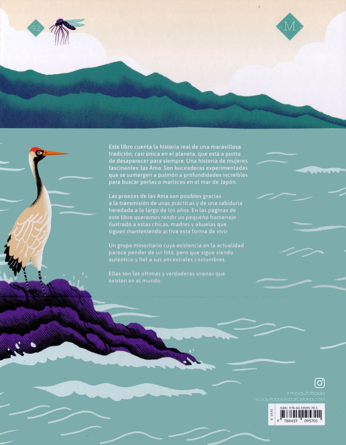 Tipo de pasta: Con este título Mosquito inaugura la nueva colección LAS ÚLTIMAS MUJERES, en este caso presenta la milenaria cultura de las AMA, las buceadoras japonesas que hasta hace poco se sumergían diariamente en las frías aguas del mar del Japón para buscar ostras, perlas, marisco y otros valiosos frutos del mar. Esta actividad dio paso con los siglos a una tradición marcada por el matriarcado y los valores de respeto a la naturaleza, solidaridad y comunión entre mujeres de todas las edades, al optar por la sola transmisión de generación en generación del legado de conocimientos y tradiciones AMA. Con el paso del tiempo y el inevitable empuje del turismo, que obligó a Japón a abrir sus puertas después de las grandes guerras, las Ama han sucumbido al espectáculo y han visto decrecer drásticamente su número. Un libro feminista, reivindicativo e inspirador que intenta conservar la memoria histórica.