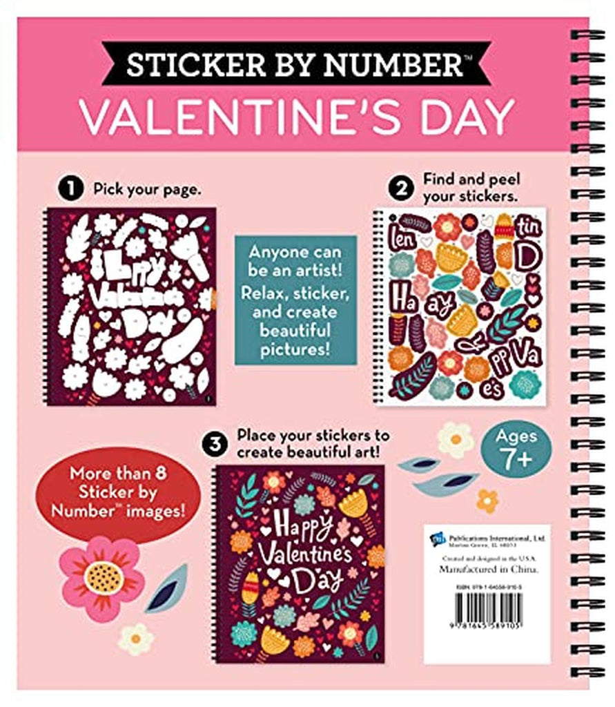 Keep your brain or child engaged while creating fun, heartwarming art, with Sticker by Number Valentine's Day! Includes 10 Valentine's Day themed or lovable images to sticker by number. Images range in difficulty. Spiral binding and perforated pages make the book easy to use. Designs targeted towards kids but adults and teens can enjoy as well! 8 x 10 inches pages.Much like color or paint by number, each design is divided into dozens of spaces. Each space has a number that corresponds to a sticker. Find the sticker, peel it, and place it in the right space. Watch as a full-color image emerges from the original unfinished illustration.
