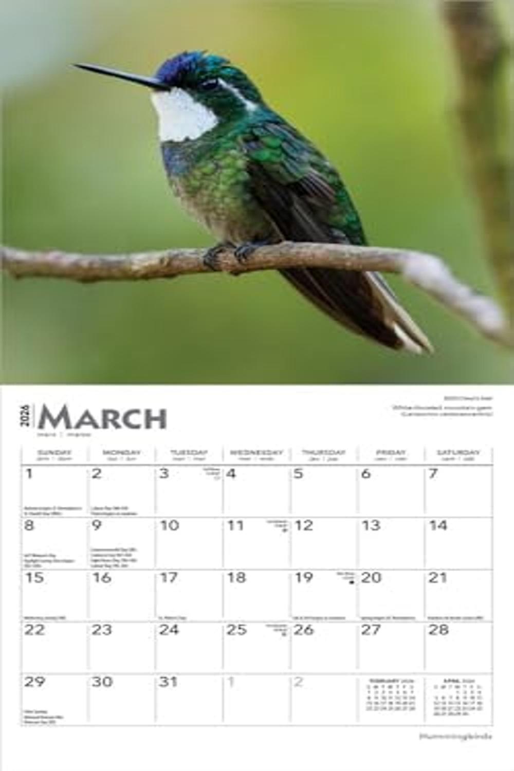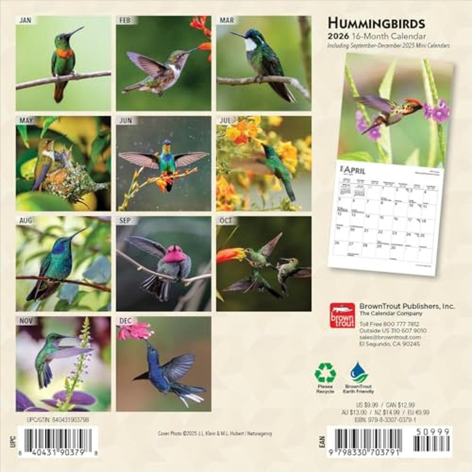 Descripción: Conocidos por su diminuto tamaño, sus brillantes colores iridiscentes y su vuelo suspendido, los colibríes viven únicamente en el hemisferio occidental. Sin embargo, se pueden encontrar prácticamente en cualquier lugar entre Argentina y Alaska. Los primeros exploradores españoles llamaron a estas aves migratorias "joyas voladoras". Este colorido calendario presenta hermosas imágenes de estas vibrantes aves.
