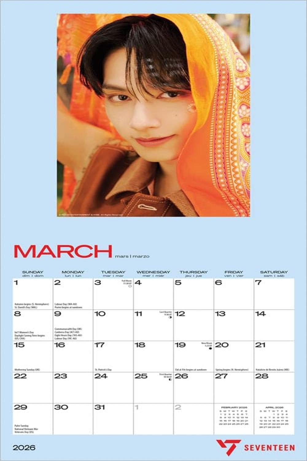 Descripción: La singular boy band, Seventeen (o SVT), profundamente involucrada en su propio proceso creativo y producción, es un fenómeno mundial del K-pop que se reinventa con cada nuevo álbum, deleitando a sus millones de fans año tras año. Con su último lanzamiento, SEVENTEEN 11TH MINI ÁLBUM 'SEVENTEENTH HEAVEN' / PM 2:14 Ver., llega este calendario de pared con licencia oficial, repleto de 12 de las fotos más elegantes y memorables de su carrera hasta la fecha.