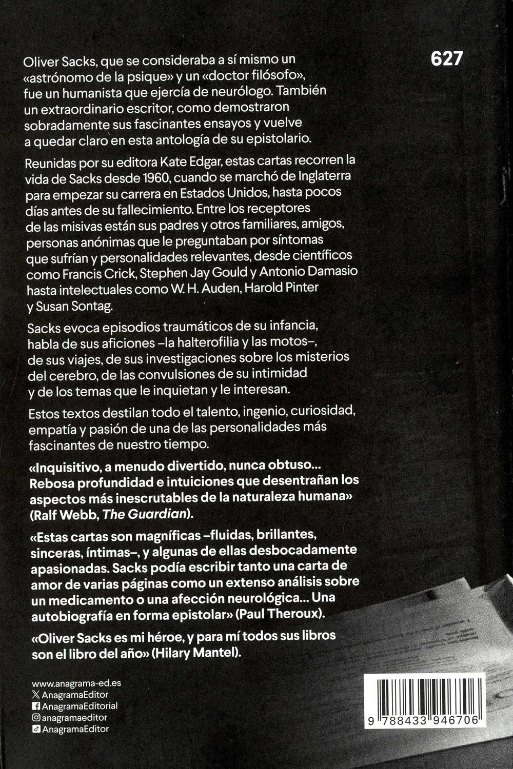 Descripción: Oliver Sacks en sus cartas: un derroche de talento, ingenio, curiosidad, empatía y pasión. Oliver Sacks, que se consideraba a sí mismo un "astrónomo de la psique" y un "doctor filósofo", fue un humanista que ejercía de neurólogo. También un extraordinario escritor, como demostraron sobradamente sus fascinantes ensayos y vuelve a quedar claro en esta antología de su epistolario. Reunidas por su editora Kate Edgar, estas cartas recorren la vida de Sacks desde 1960, cuando se marchó de Inglaterra para empezar su carrera en Estados Unidos, hasta pocos días antes de su fallecimiento. Entre los receptores de las misivas están sus padres y otros familiares, amigos, personas anónimas que le preguntaban por síntomas que sufrían y personalidades relevantes, desde científicos como Francis Crick, Stephen Jay Gould y Antonio Damasio hasta intelectuales como W. H. Auden, Harold Pinter y Susan Sontag.