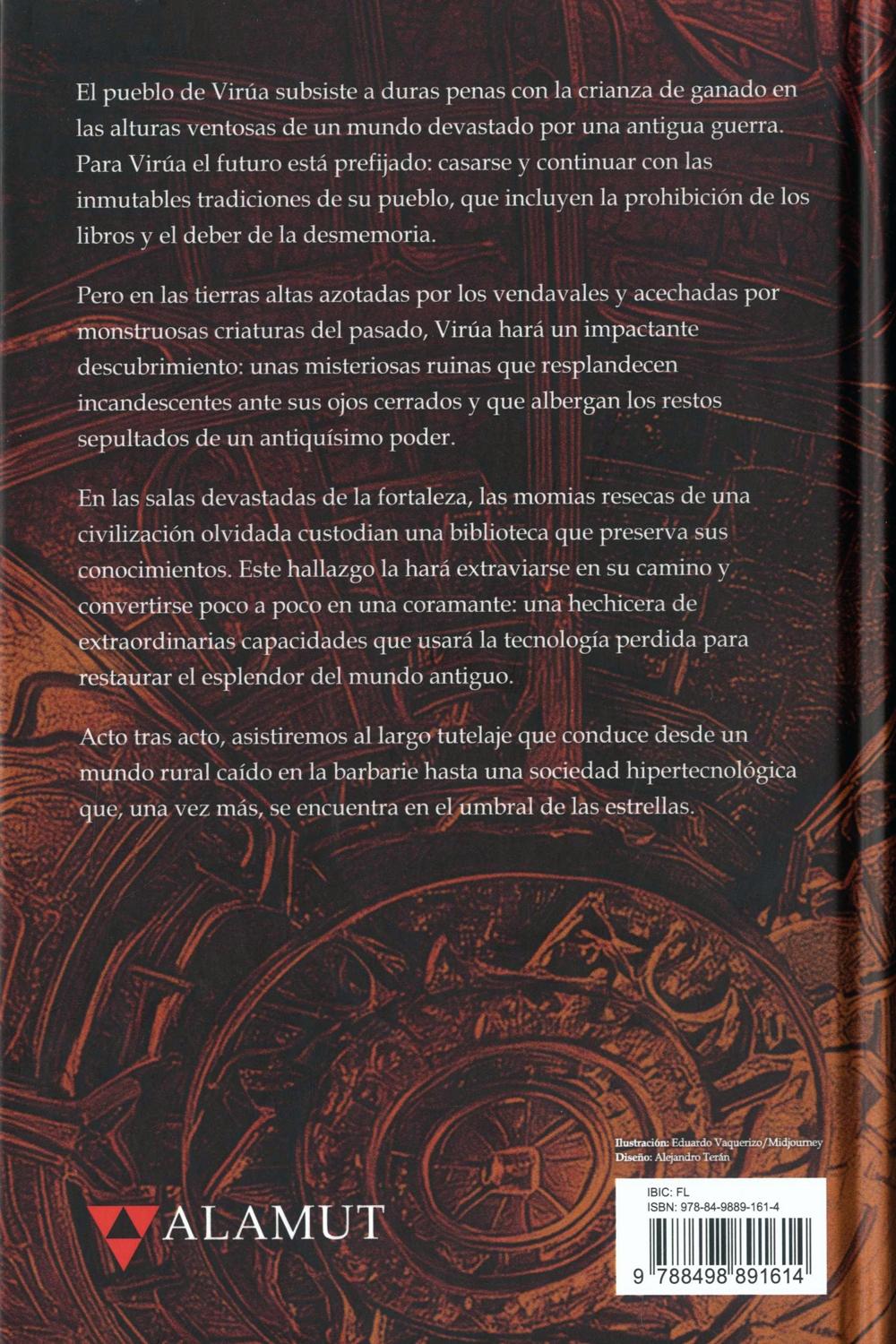 Descripción: ¡Vuelve el sentido de la maravilla en este gran fresco que abarca miles de años! Ciencia ficción de largo aliento, digna heredera de los grandes clásicos de nuestro género. El pueblo de Virúa subsiste a duras penas con la crianza de ganado en las alturas ventosas de un mundo devastado por una antigua guerra. Para Virúa el futuro está prefijado: casarse y continuar con las inmutables tradiciones de su pueblo, que incluyen la prohibición de los libros y el deber de la desmemoria. Pero en las tierras altas azotadas por los vendavales y acechadas por monstruosas criaturas del pasado, Virúa hará un impactante descubrimiento: unas misteriosas ruinas que resplandecen incandescentes ante sus ojos cerrados y que albergan los restos sepultados de un antiquísimo poder. En las salas devastadas de la fortaleza, las momias resecas de una civilización olvidada custodian una biblioteca que preserva sus conocimientos.