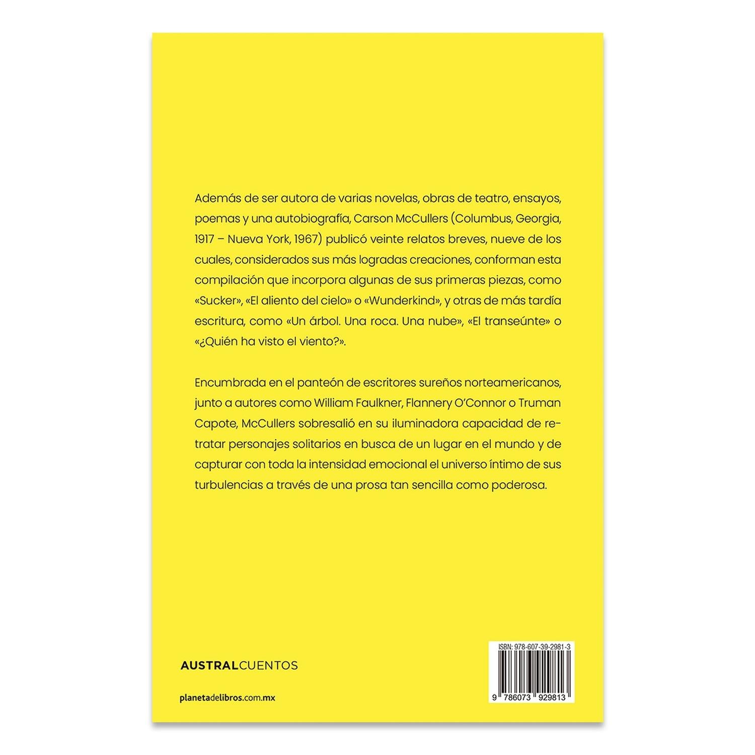 Descripción: Uno de los más importantes exponentes, junto con William Faulkner, de la narrativa del sur de Estados Unidos. Además de ser autora de varias novelas, obras de teatro, ensayos, poemas y una autobiografía, Carson McCullers (Columbus, Georgia, 1917 – Nueva York, 1967) publicó veinte relatos breves, nueve de los cuales, valorados entre sus más logradas creaciones, conforman esta selección, que incorpora algunas de sus primeras piezas, como «Sucker»,«El aliento del cielo» o «Wunderkind», y otras de más tardía escritura, como «Un árbol. Una roca. Una nube», «El transeúnte» o «¿Quién ha visto el viento?». Encumbrada al panteón de escritores sureños norteamericanos junto a autores como William Faulkner, Flannery O’Connor o Truman Capote, McCullers sobresalió en su iluminadora capacidad de retratar personajes solitarios en busca de un lugar en el mundo y de capturar con toda la intensidad emocional el universo íntimo de sus turbulencias a través de una prosa tan sencilla como poderosa.