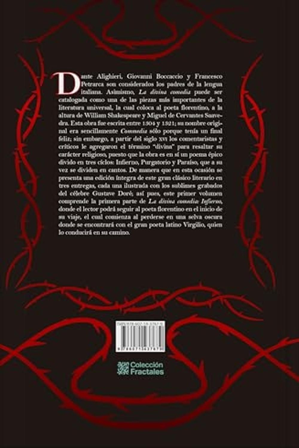 Descripción: (La portada puede variar) Dante Alighieri es considerado, junto con Giovanni Boccaccio (autor del Decamerón) y Francesco Petrarca, los padres de la lengua italiana que se consolida a partir del dialecto toscano, presente en la mayoría de sus escritos. Asimismo, La divina comedia puede ser catalogada como una de las obras más importantes de la literatura universal que colocan a Dante Alighieri a la altura de William Shakespeare y Miguel de Cervantes Saavedra. Esta obra fue escrita entre 1304 y 1321, su nombre original era sencillamente Comedia solo porque tenía un final feliz; sin embargo, a partir del siglo XVI los comentaristas y críticos le agregaron el término “divina” para resaltar su carácter religioso. Así pues, la obra es en sí un poema épico divido en tres partes: Infierno, Purgatorio y Paraíso, que a su vez se dividen en cantos. En esta ocasión este libro presenta una edición íntegra de la primera parte de este clásico literario: Infierno, acompañado de las ilustraciones clásicas de Gustave Doré que han cortejado la obra magnánima por siglos. Así, el lector podrá seguir al poeta florentino Dante en el inicio de su viaje imaginario que comienza al perderse en una selva oscura y donde se encontrará con el poeta latino Virgilio, que lo conducirá en su camino.
